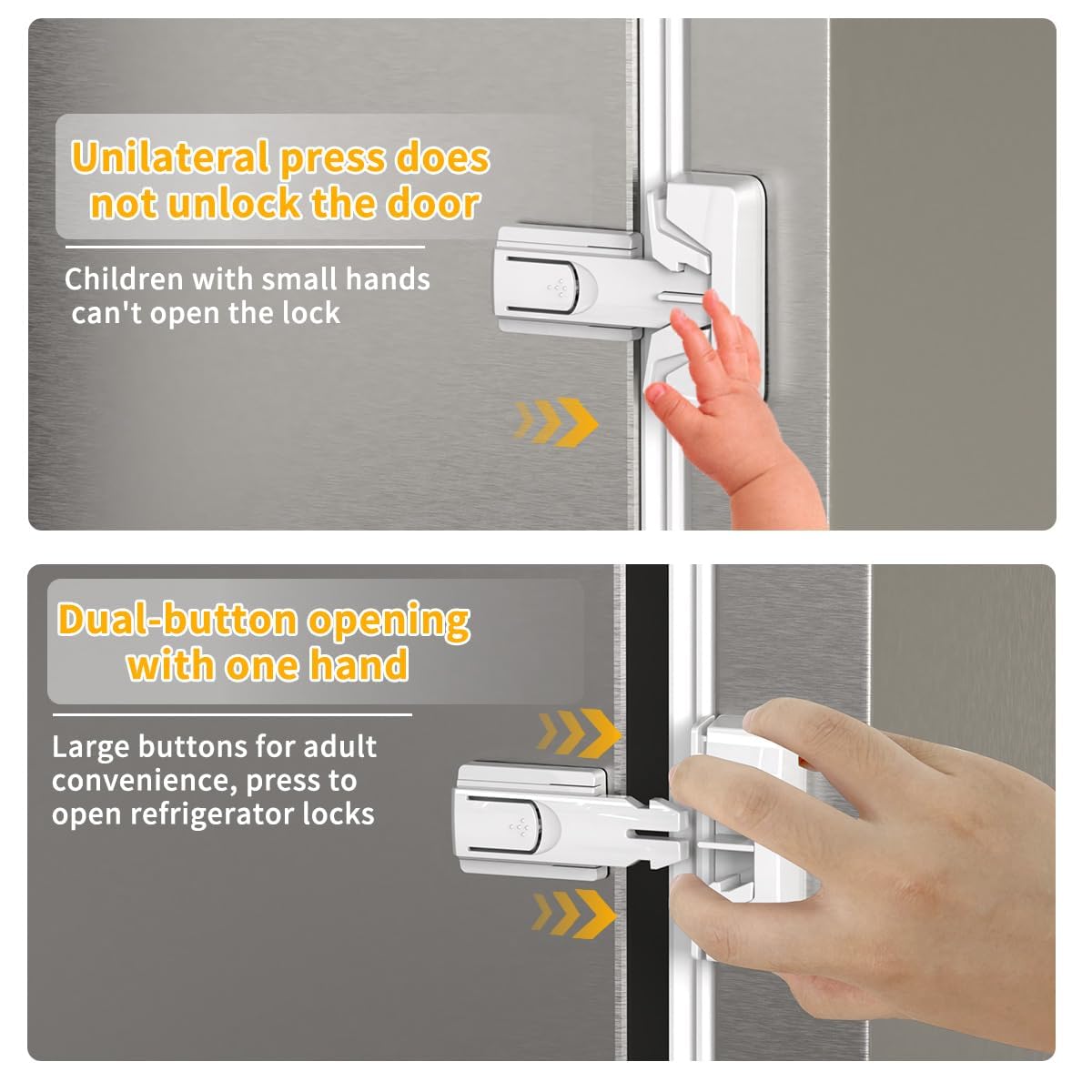 Easy One Hand Operation: Simply press the release button on both sides and pull outward to unlock and open the refrigerator door in the meantime, close the fridge with the lock automatically lock. The redesigned infant refrigerator lock features a widened 60mm spacing between the dual buttons, safety and more comfortable. Easy for adults to open but hard for children