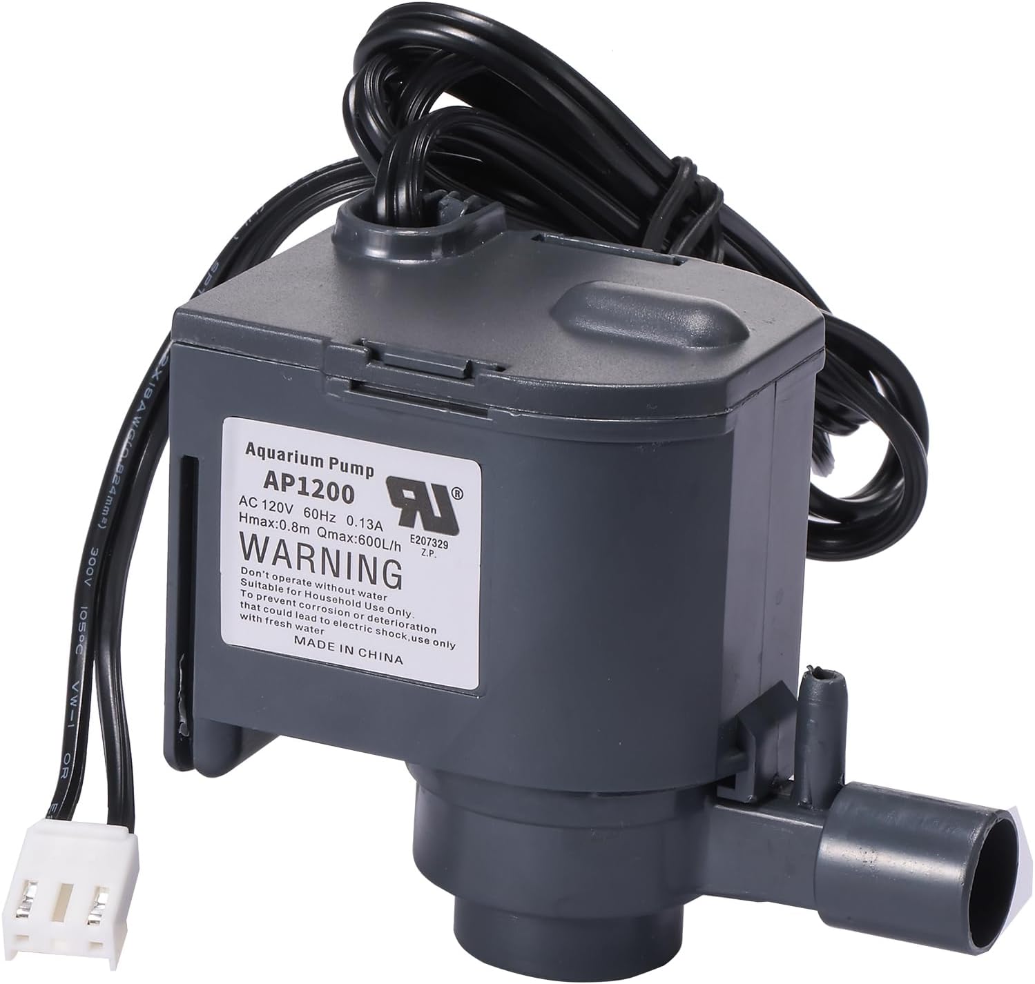 SIZE: ‎47x46x60mm Water Outlet Diameter: 15.5mm, Rated Voltage: AC 120V 60Hz 0.13A Hmax:0.8m Qmax:600L/h. Warranty: 24 months.