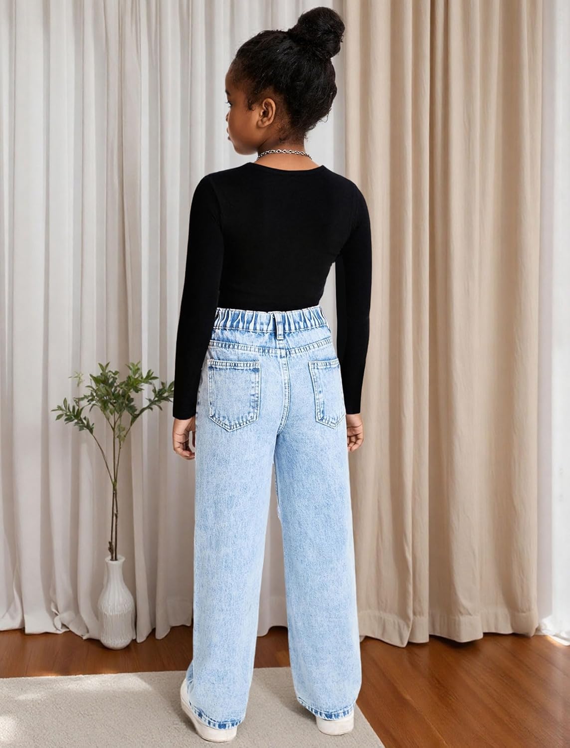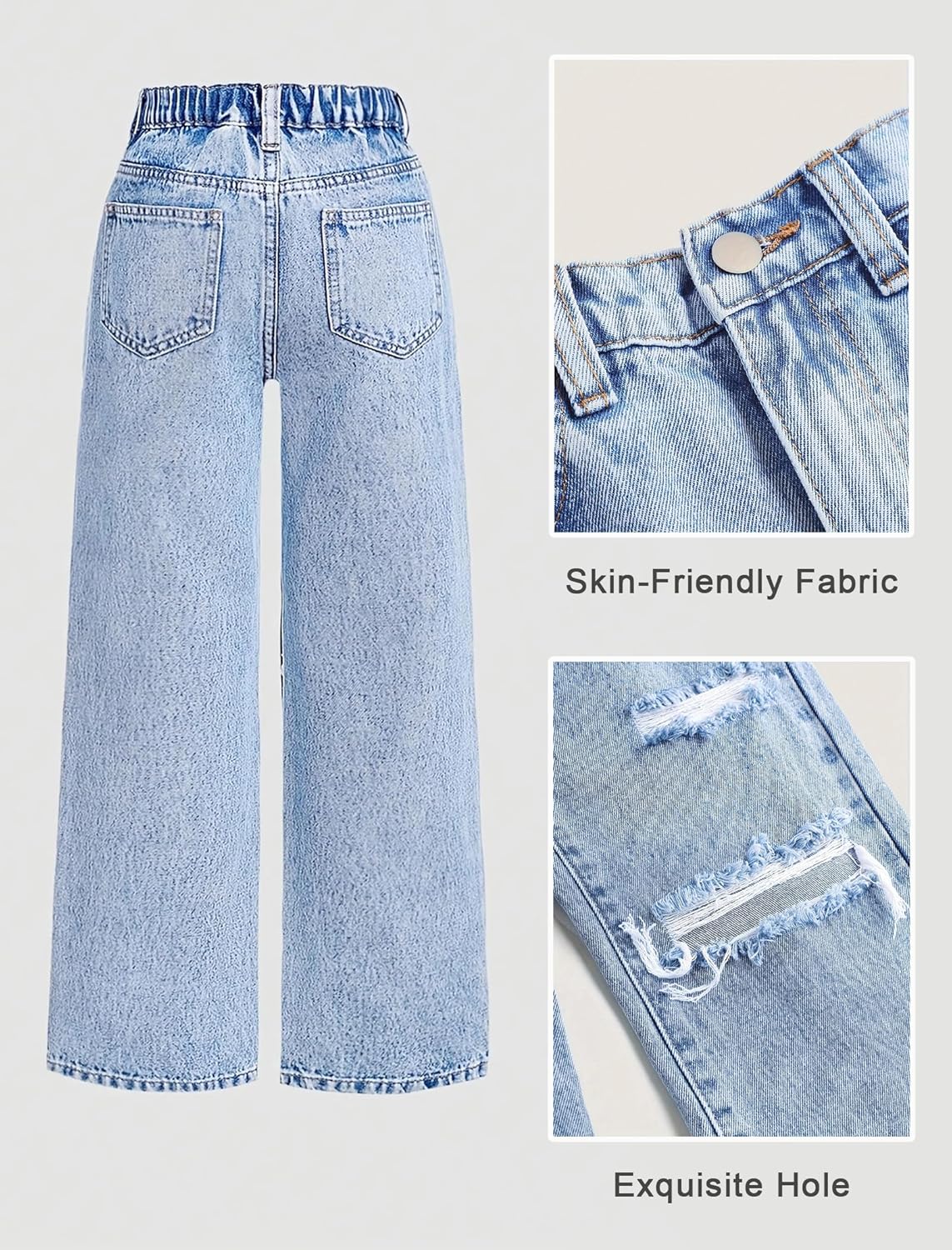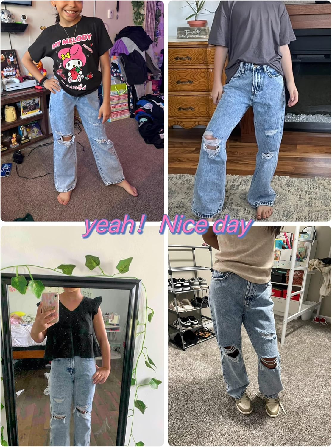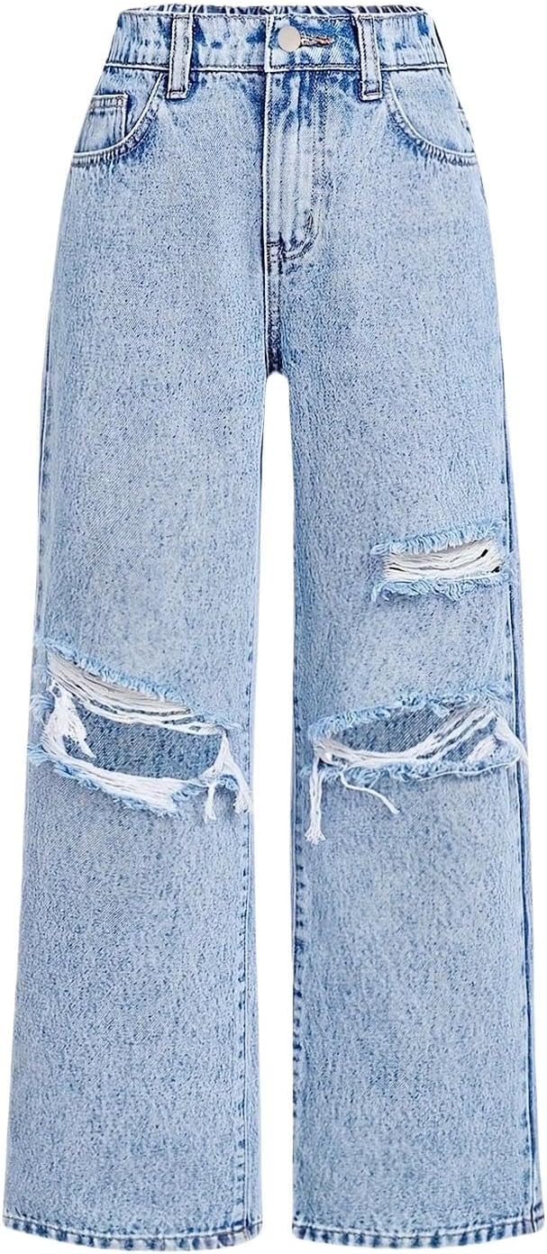 Buy Baggy Jeans for Girls Wide Leg Ripped High Elastic Waisted Denim Pants Cute Summer Trousers Y2K Streetwear 7-14Y online from amazon or ebay or walmart Baggy Jeans for Girls Wide Leg Ripped High Elastic Waisted Denim Pants Cute Summer Trousers Y2K Streetwear 7-14Y