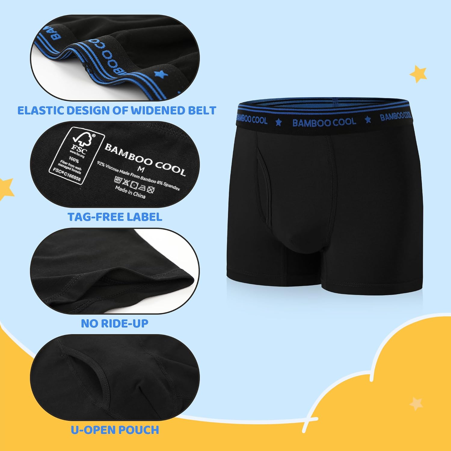 BAMBOO COOL Boys’ Underwear Moisture-Wicking Brethable Boxer Briefs Soft Lightweight Tag-Free with Fly Pouch 6-Pack
