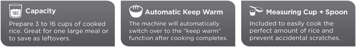 AUTOMATIC KEEP WARM – The rice stays ready for serving! The unit automatically switches to the “keep warm” function after cooking is complete, keeping fluffy rice ready to serve long after cooking