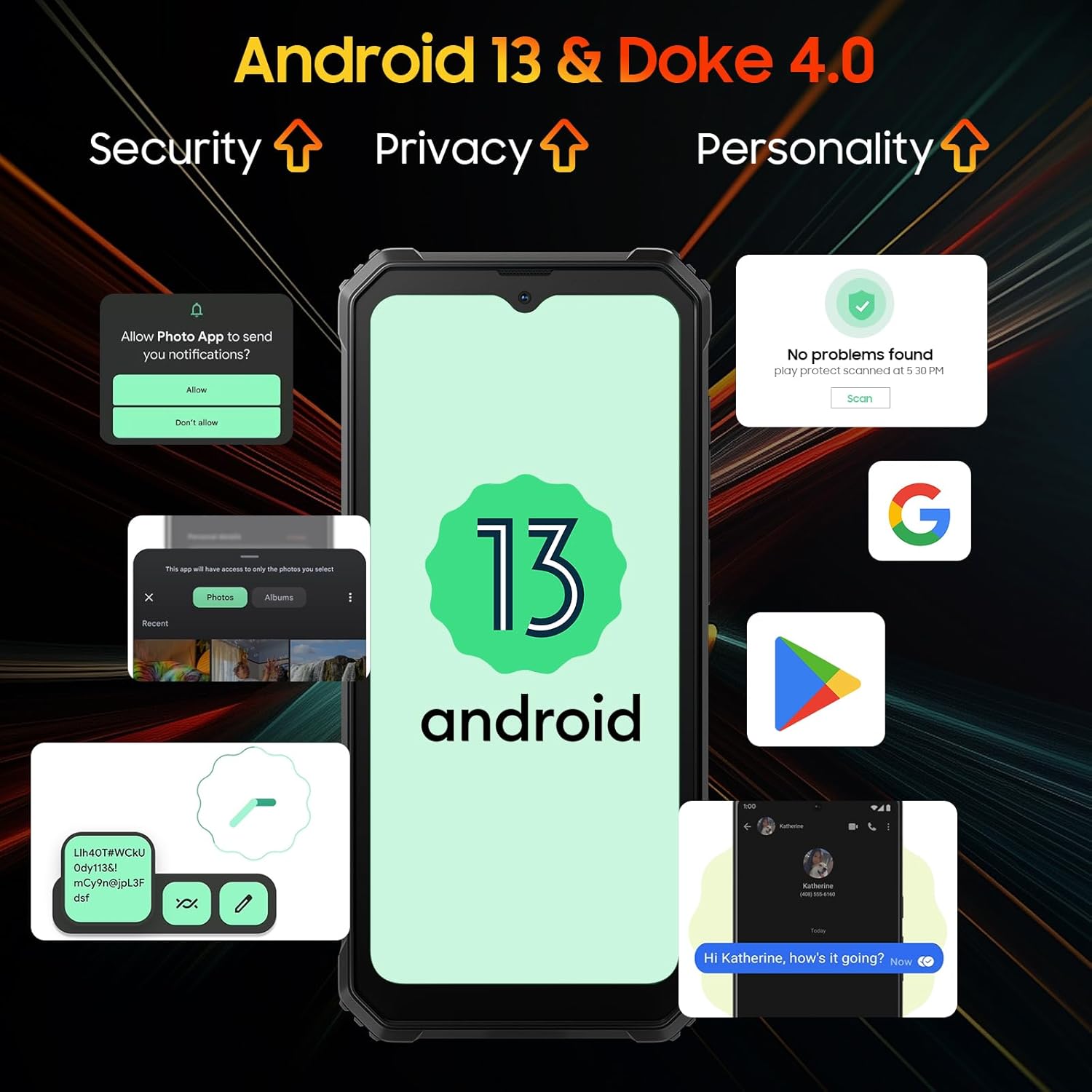 【Android 13 & Doke OS 3.1 System】The BV4800 rugged smartphone unlocked come equipped with the lAndroid 13 operating system, enhancing privacy and personalization experience. This Android 13 android phones offers per-app language preferences, a data migration assistant, cleared clipboard history, notification permissions, easy sharing, and real-time subtitles. There’s more! With the Doke OS 3.1 integration, enjoy additional functionalities like call recording and exercise index tracking.