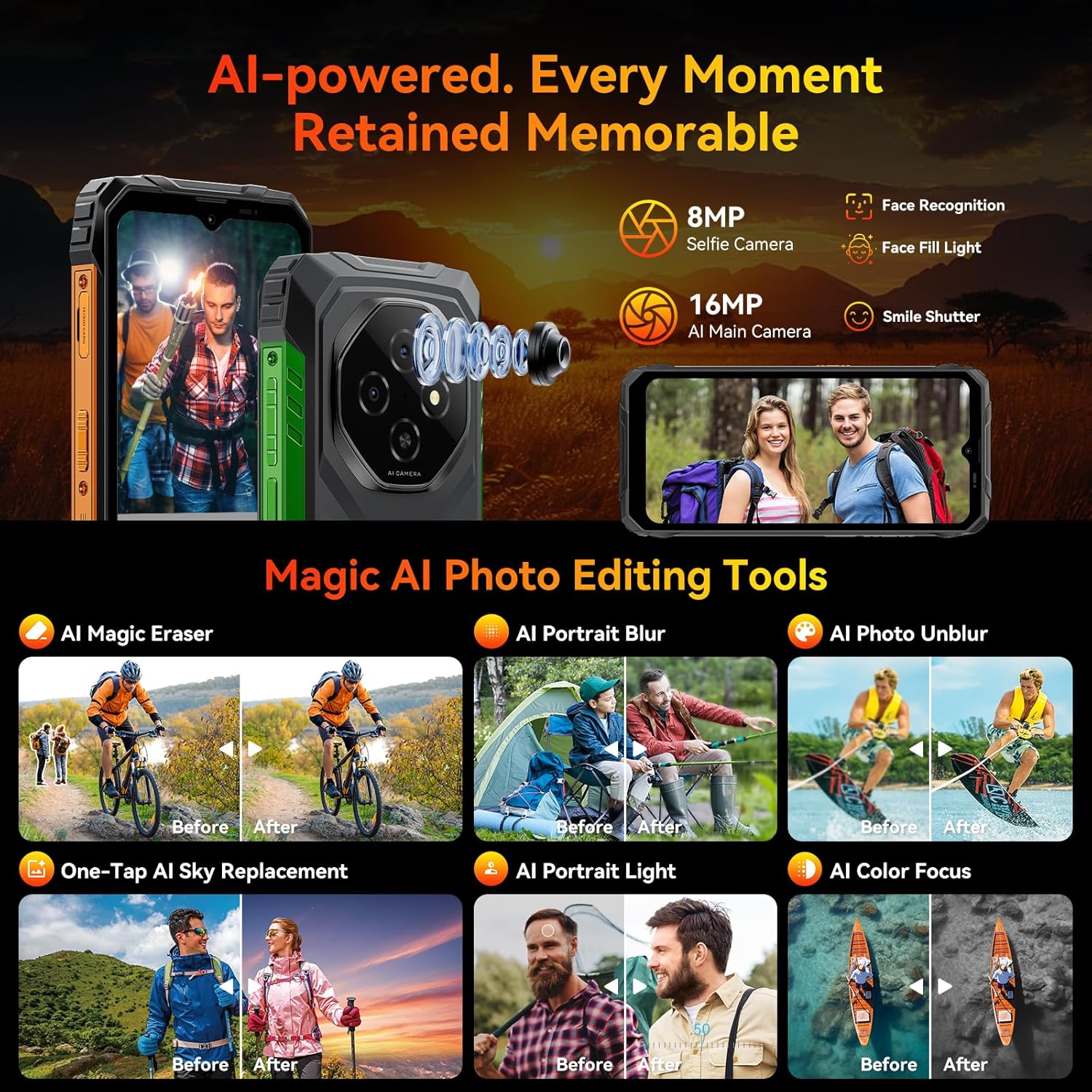 【6.56“ Big Screen & 16MP Main Camera】The Blackview Fort 1 rugged phone has a 6.56-inch screen with a screen-to-body ratio of up to 83%. The resolution is 720*1612 with up to 450 nits brightness, the visual effect is fascinating. Compared with similar mobile phone, Fort 1 has a larger screen, providing a more comfortable viewing experience. The 16MP AI rear camera and 8MP front camera capture stunning details with panoramic, beautiful, and HDR modes. This waterproof cell phone ensures sharp, immersive images and videos.