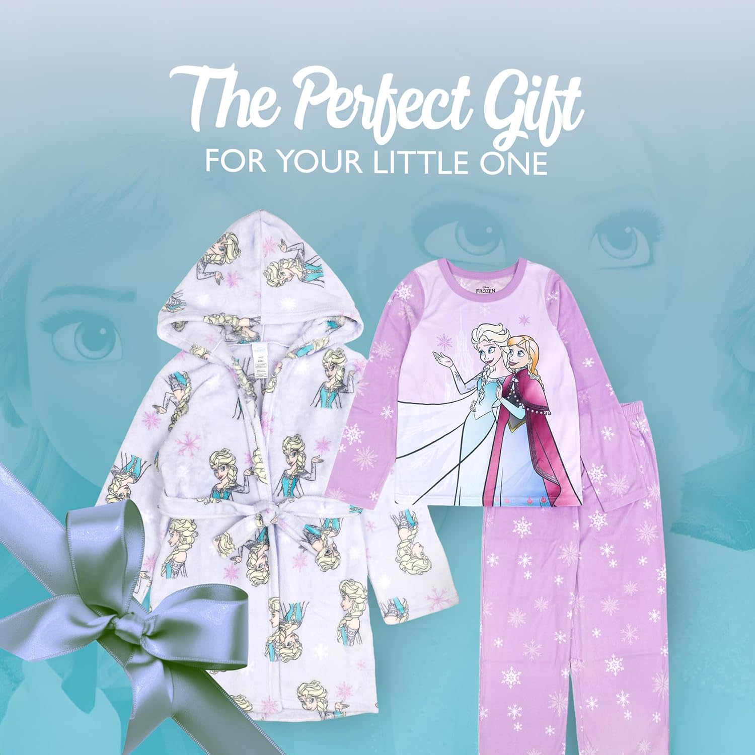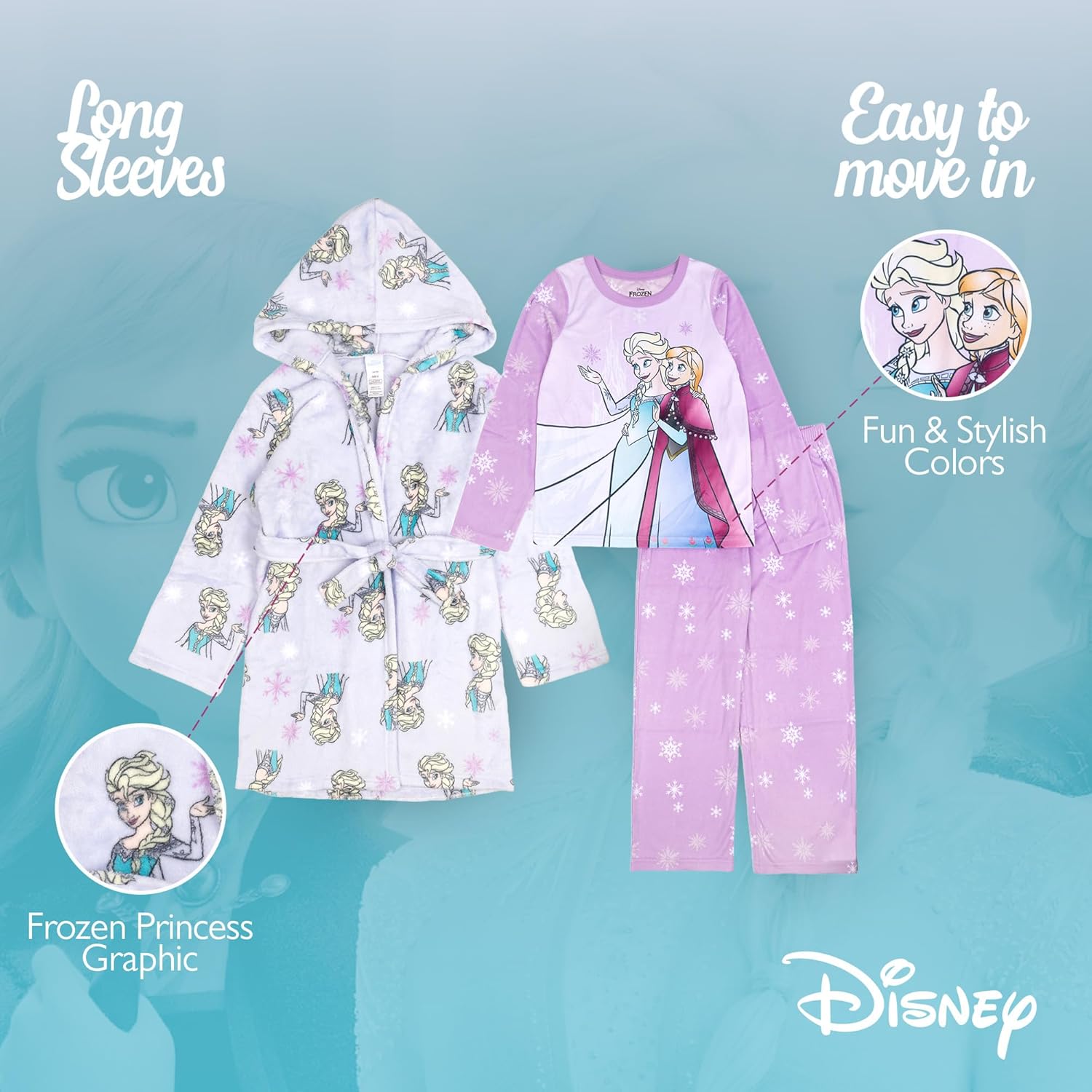 WARM & COZY BATHROBE AND 2 PIECE PAJAMA SET: Get your child ready for adventures in this comfortable and adorable Disney Princess set. Comes with one bathrobe and a 2-piece pajama set. Officially licensed Disney merchandise. Available in sizes 2T–10.