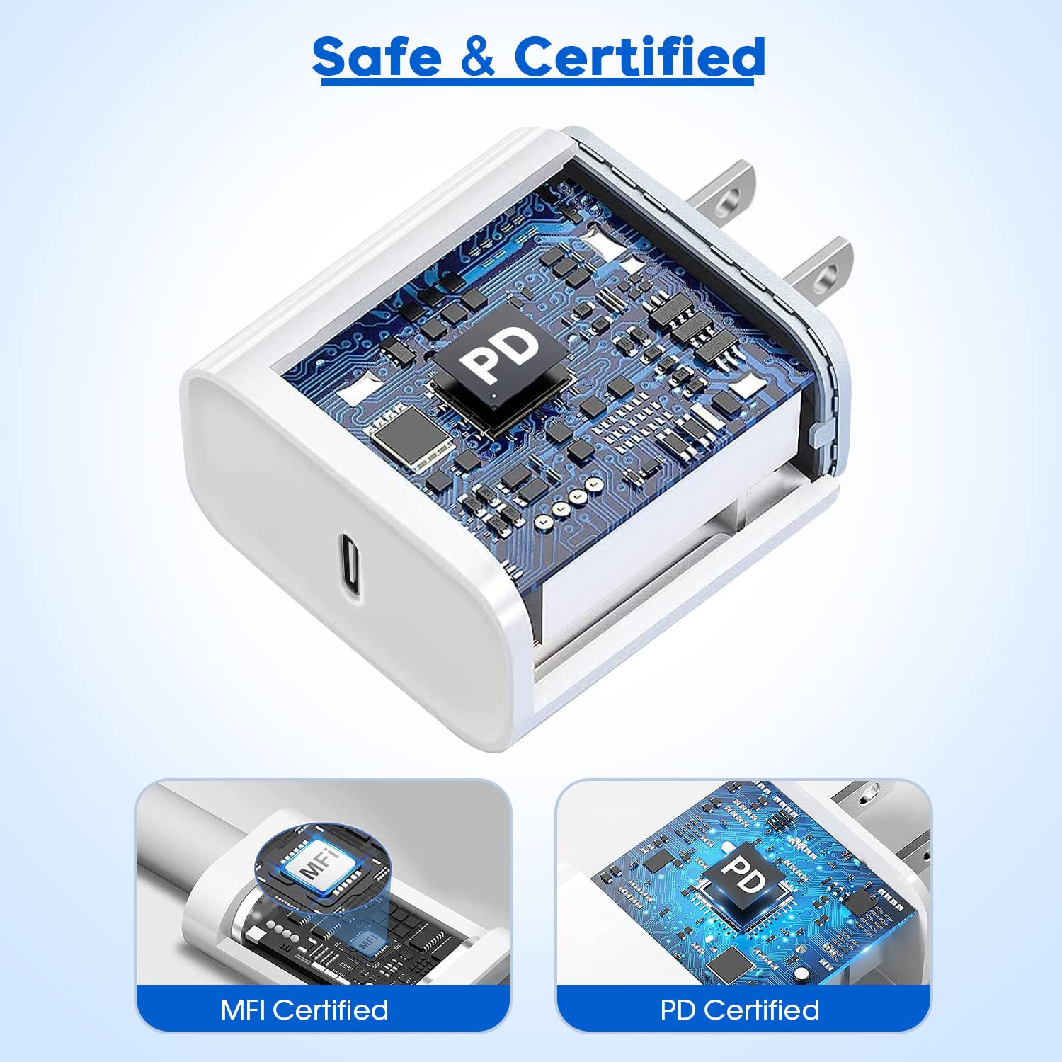 【iPhone Charger Fast Charging】Equipped with Fast iPhone Charging USB Type C power delivery wall plug, PD 3.0 Quick-Charge USB C port provides Max 20W output power, charge your device up to 3X faster than original 5W charger, charging your iPhone up to 50% in just 35 minutes, saving over 1.5hrs for you. Helps You Work Efficiently.