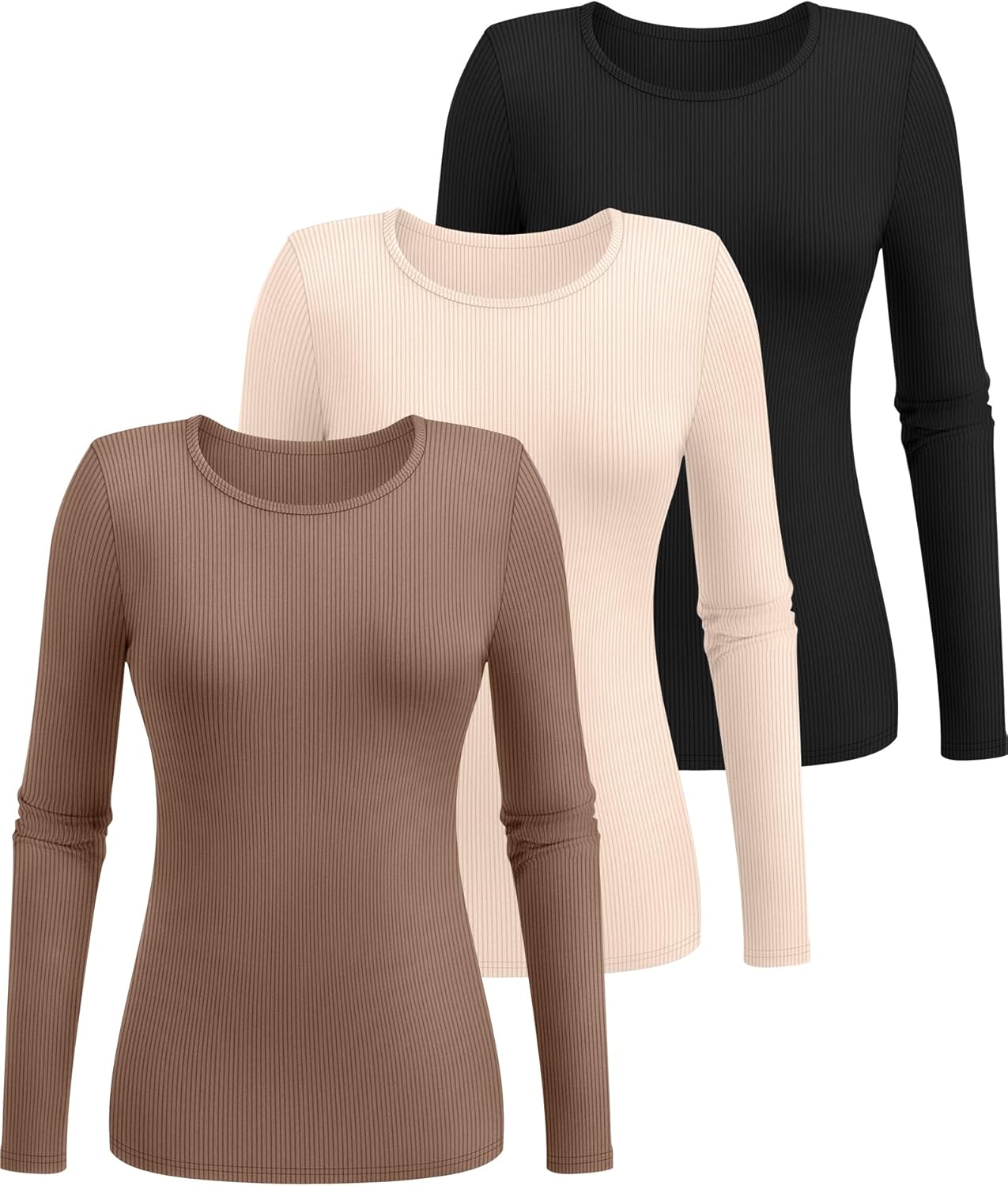 Ficerd 3 Pack Women’s Ribbed Long Sleeve Tops, Crew Neck Slim Fit Undershirts Knit Basic Casual Stretch Layering Tee Shirts