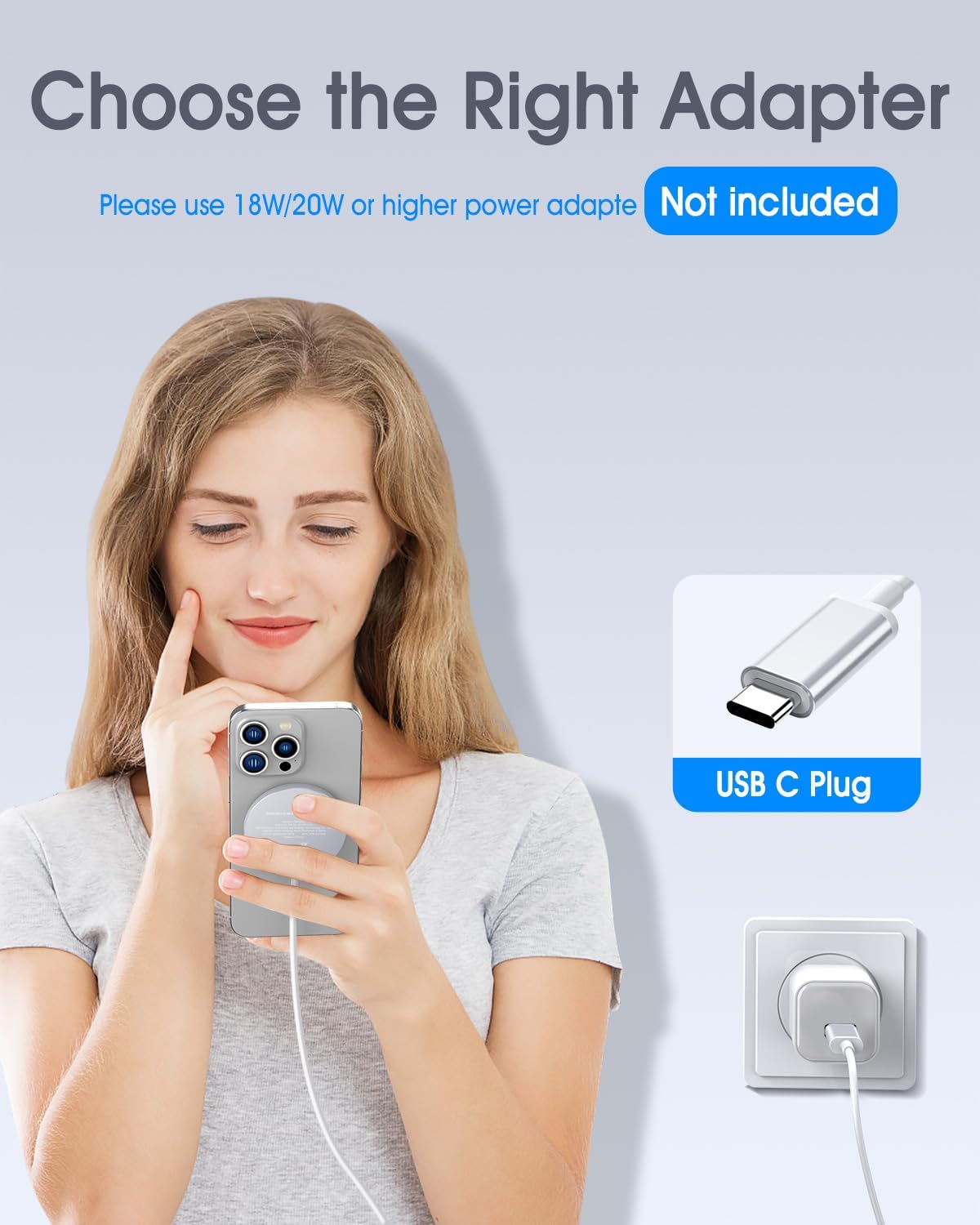 【Magnetic Wireless Charging Pad】Quickly power up your iPhone to 50% in just 30 minutes and from 0 to 100% in just 2-2.5 hours—significantly faster than the original 5W iPhone chargers.Firmly holds your iPhone while charging,no sliding or falling off.Charging with this magnetic wireless charger gives you a fast,safe and convenient charging experience.For best charging result,please use an 18W/20W or higher power adapter(USB adapter and plug not included)