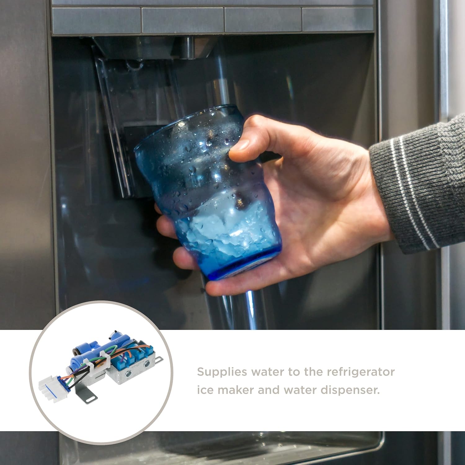 Water inlet valve WR57X10098 supplies water to the refrigerator ice maker and water dispenser