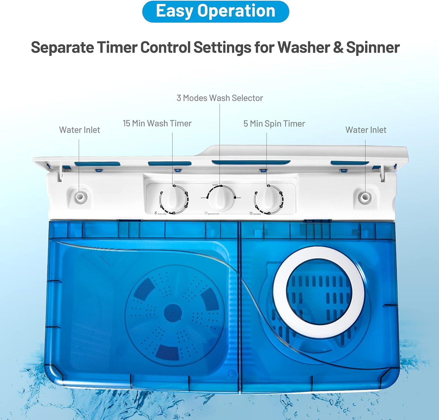 [Separate Timer & 3 Selection Modes]: 15 minutes washing time and 5 minutes spinning time can be freely set based on your laundry types. In addition, there are 3 modes for your selection. Gentle and normal are for washing. After washing, you can select drain mode to drain out water inside wash tub. For example, gentle mode takes 3-5 minutes to wash silk or floss clothing.