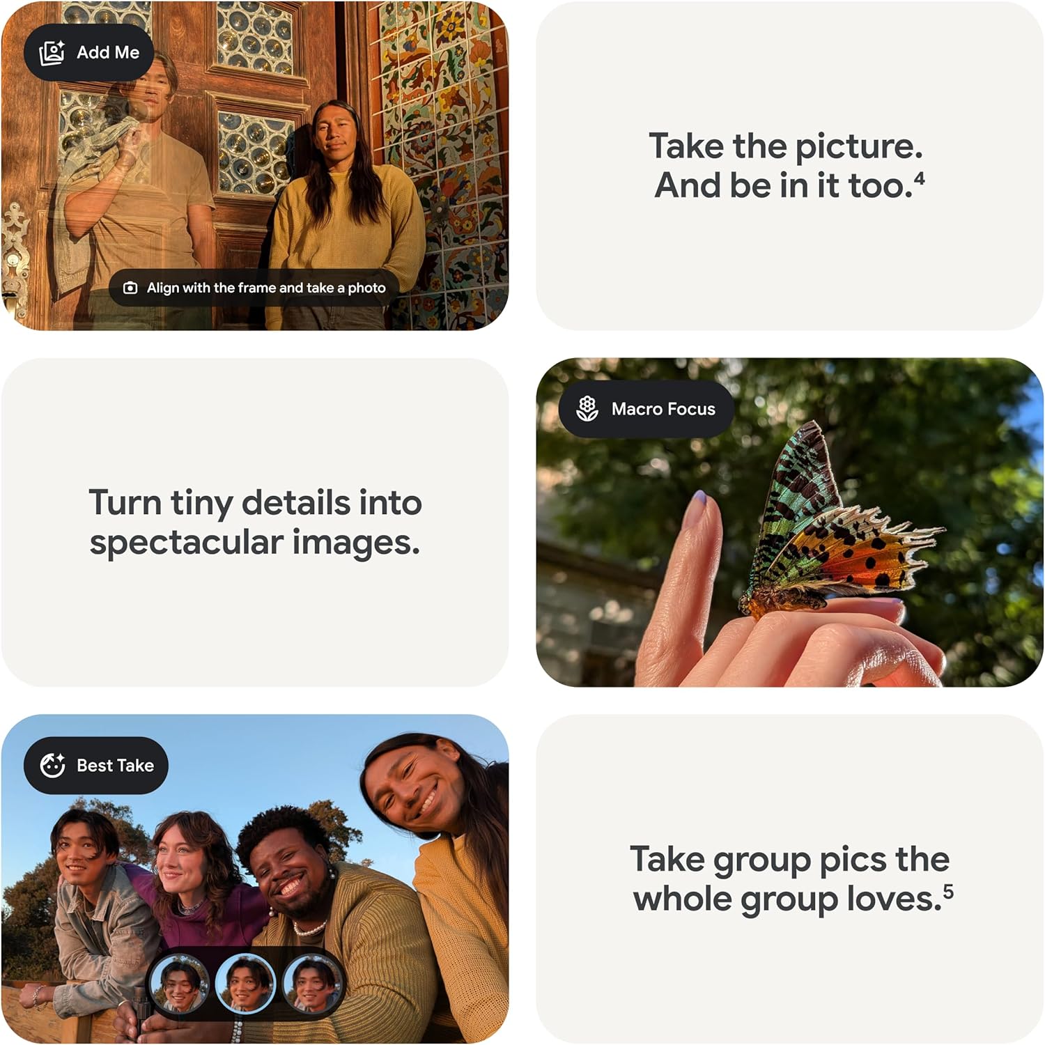 Take amazing photos and videos with the Pixel Camera, and make them better than you can imagine with Google AI; get great group photos with Add Me and Best Take[4,5]; and use Macro Focus for spectacular images of tiny details like raindrops and flowers