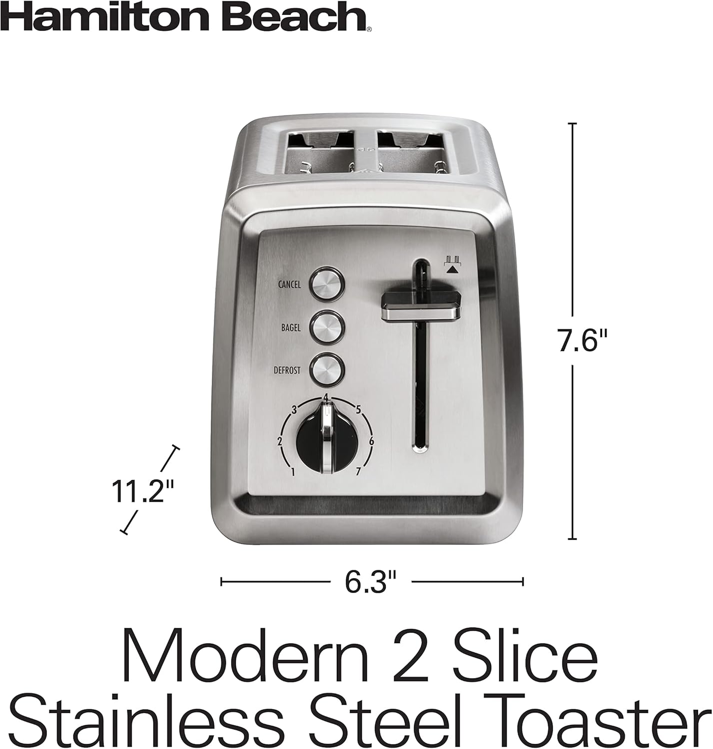 The Hamilton Beach® Modern 2 Slice Stainless Steel Toaster with extra-wide slots has advanced features to easily toast any bread. Includes bagel, defrost, and cancel options, plus an easy-to-grip shade selector with 7 toast shades.
