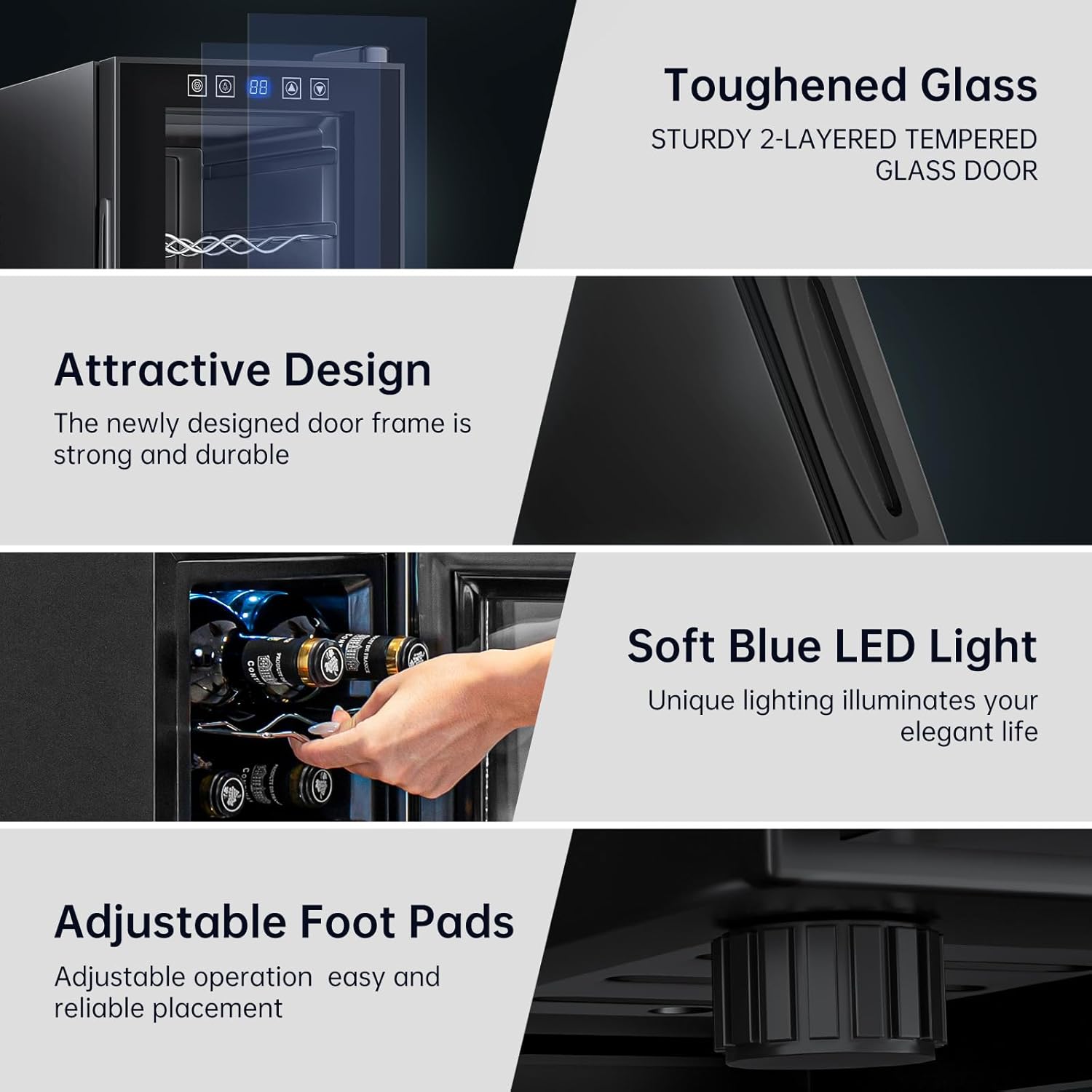 Customers find the wine cooler effective at maintaining set temperatures and appreciate its capacity to hold up to 12 bottles, with one mentioning it can accommodate 4 wide-based bottles. They describe it as elegant, with one noting its see-through front door design, and praise its quiet operation and compact size. Customers find it easy to use and appreciate its functionality, with one mentioning it automatically turns off after 10 minutes of inactivity.