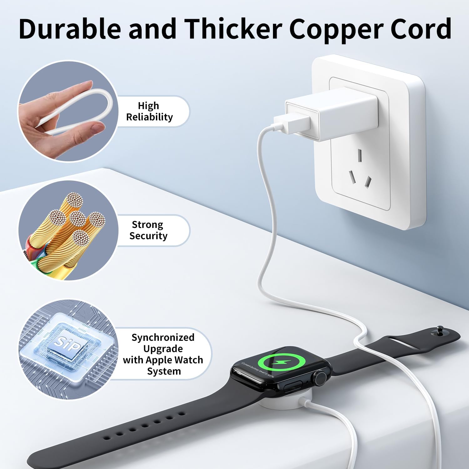 Customers find the Apple Watch charger reliable and well-made, with a strong magnetic connection that keeps the watch securely in place. The device charges quickly, with one customer noting it takes about an hour to reach 100%, and comes with all necessary components including a charging block. Customers appreciate the good length of the cable and consider it good value for money.