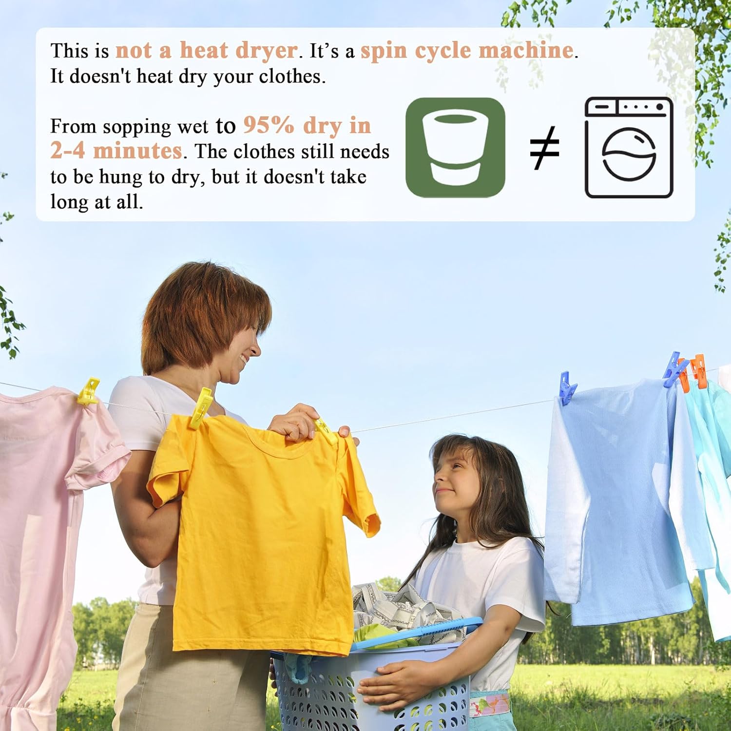 【NOT a Dryer 】 This is not a dryer. It’s a spin cycle machine. It doesn’t heat dry your clothes. From sopping wet to 95% dry in 2-4 minutes. The clothing still needs to be hung to dry, but it doesn’t take long at all. A pair of pants usually take two days to dry and they will dry in a matter of hours if you use this dryer.