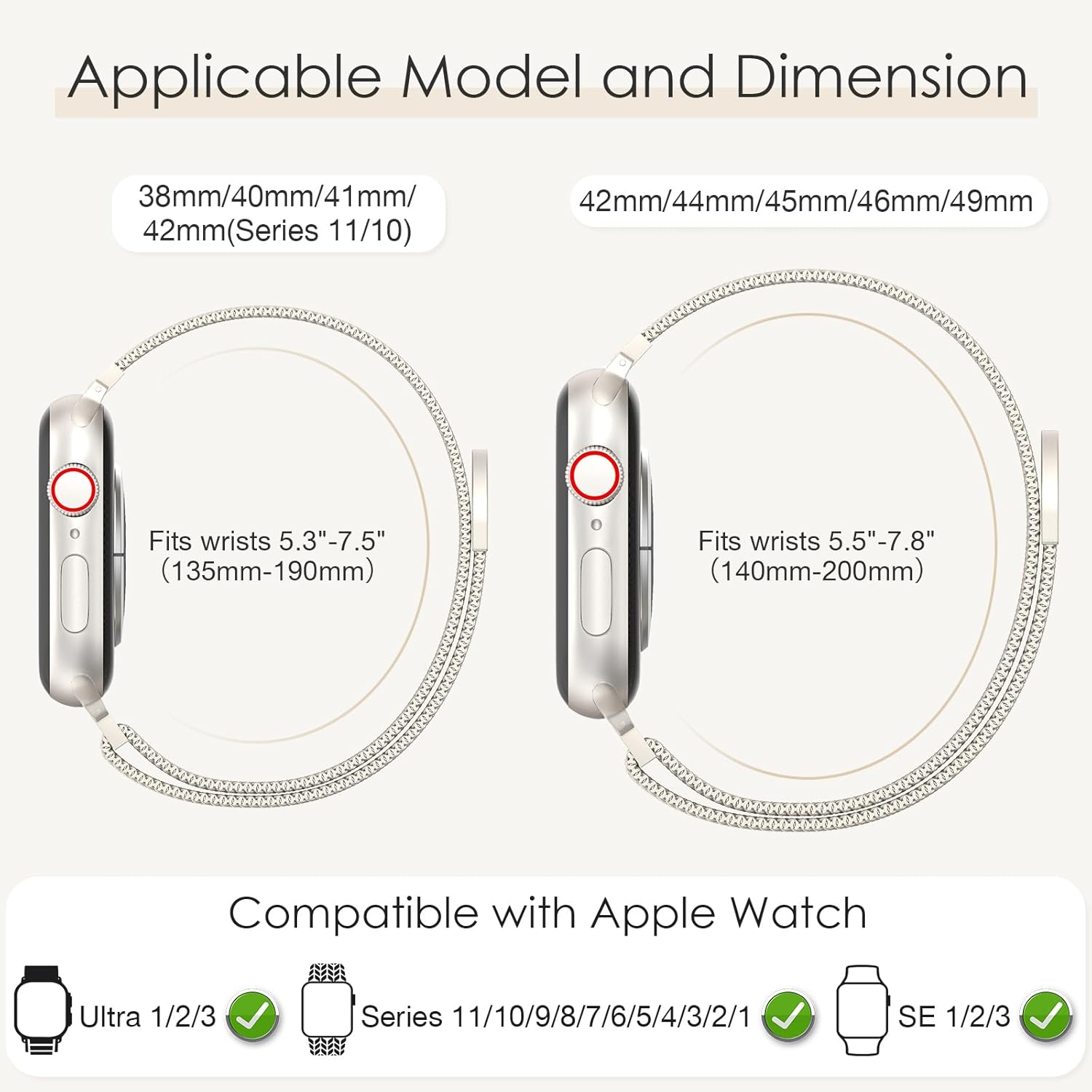 Compatible ALL Models – Perfect compatoble with Apple Watch Bands Series 11 10 -(42mm), Series 9 8 7 -(41mm), Series 6 5 4 SE3 SE2 -(40mm), Series 3 2 1 SE -(38mm), Check your watch size before ordering. The magnetic clasp allows effortless adjustment to fit any wrist size (5.3-7.5 inches), No tools needed