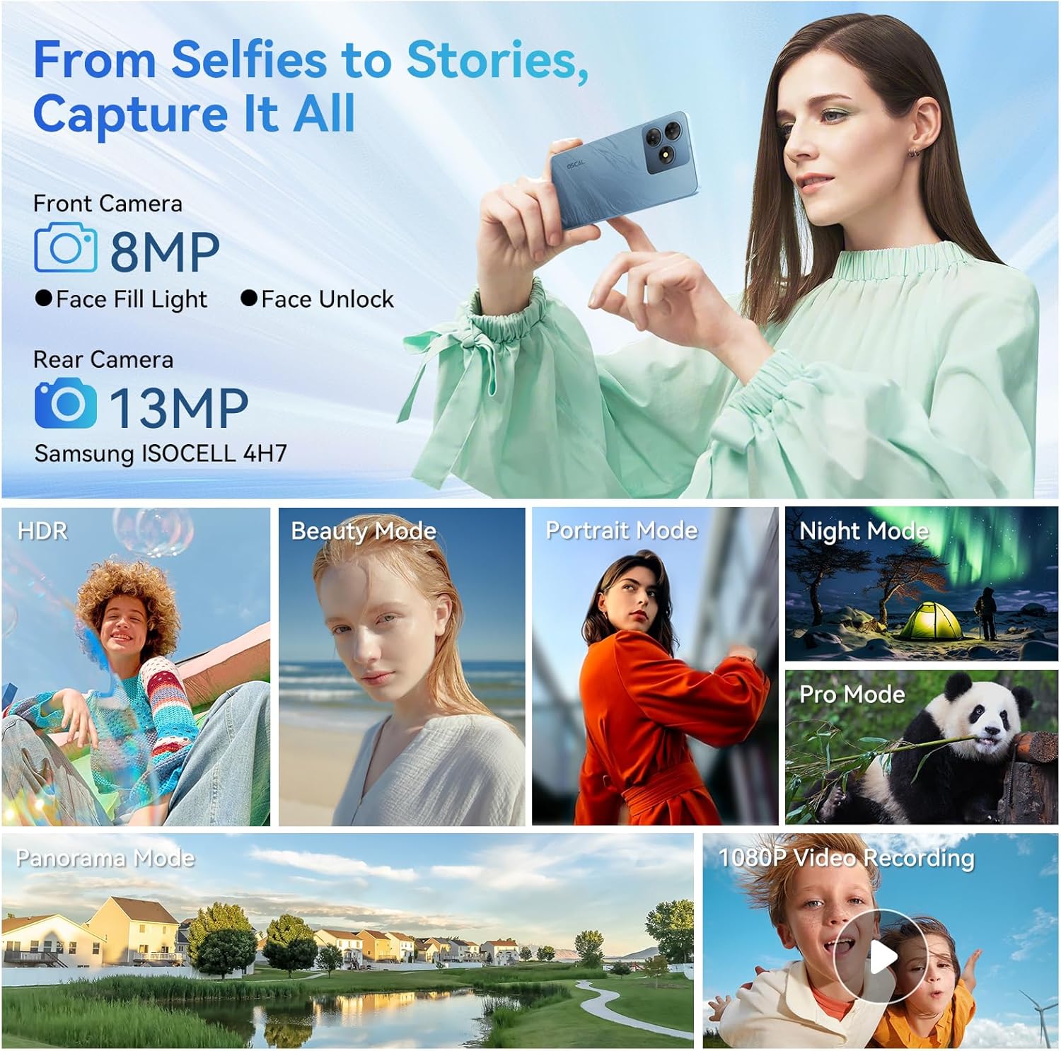 【📷AI 13MP+8MP Cameras, Record Your Wonderful Life】 OSCAL 4G android phone is equipped with a 13MP rear camera and an 8MP front camera. Whether you’re taking landscapes or selfies, you can easily take great photos, and it supports quick face unlock. Besides, this cheap android phone has a variety of shooting modes, such as Portrait, Night, Panorama and Professional, which can meet the needs of different shooting scenes.1080P video recording function, turns everyday moments into fascinating videos.