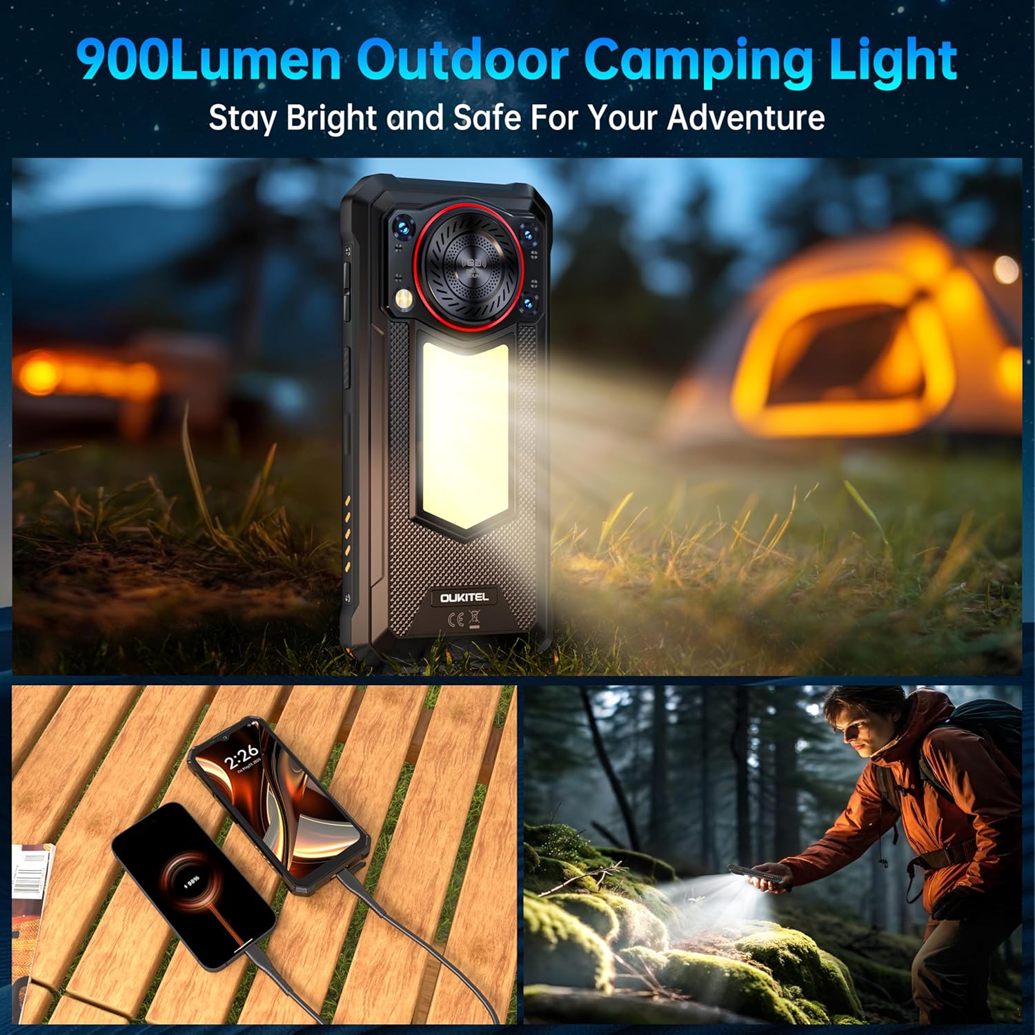 【900LM Camping Light & 128dB Speaker】WP53S is the latest outdoor phone launched by OUKITEL, equipped with a 900LM camping light that can work in three modes (full light, half light, and dim light). It can provide up to 8.5 hours of outdoor lighting and is the best companion for night travel. The phone is equipped with a 3W super speaker with a volume of up to 128dB and a diameter of up to 36mm. Whether it is music, video, calls, or used as a speaker at family gatherings, it can also be used as a siren in an emergency. OUKITEL WP53S is your ideal choice!