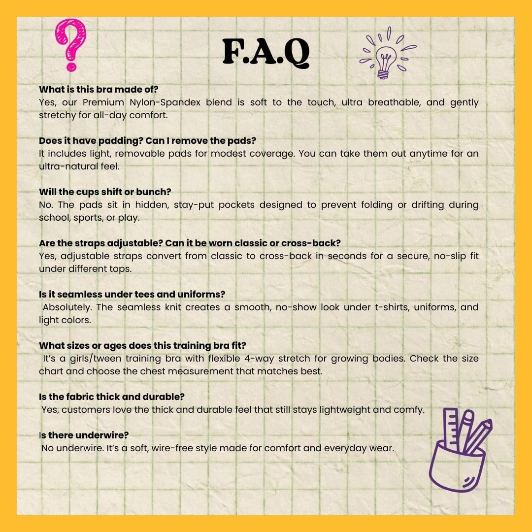 Customers find the training bra comfortable with adjustable straps that fit perfectly, and appreciate its soft fabric and suitability for preteens. The bra receives positive feedback for its quality and value for money. Regarding durability, while some say it holds up well in the washer and dryer, others report that the pads start falling apart. Size opinions are mixed, with some finding it perfect while others say it’s too small.