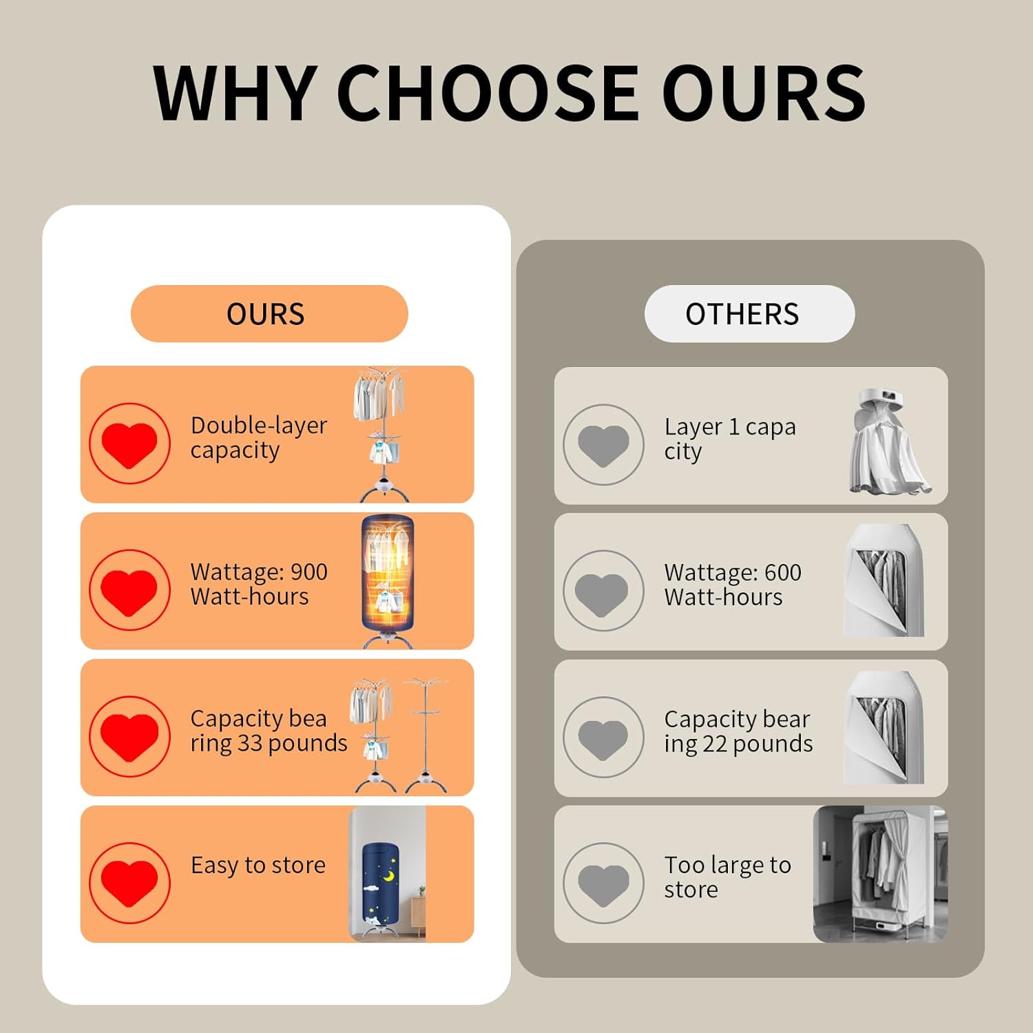 【Large Capacity】Experience quicker drying times with the portable dryer’s innovative dual-layer system. This clothes dryer evenly distributes heat across both layers. The secadora de ropa portatil is designed with efficiency, saving time and energy while maintaining fabric integrity.
