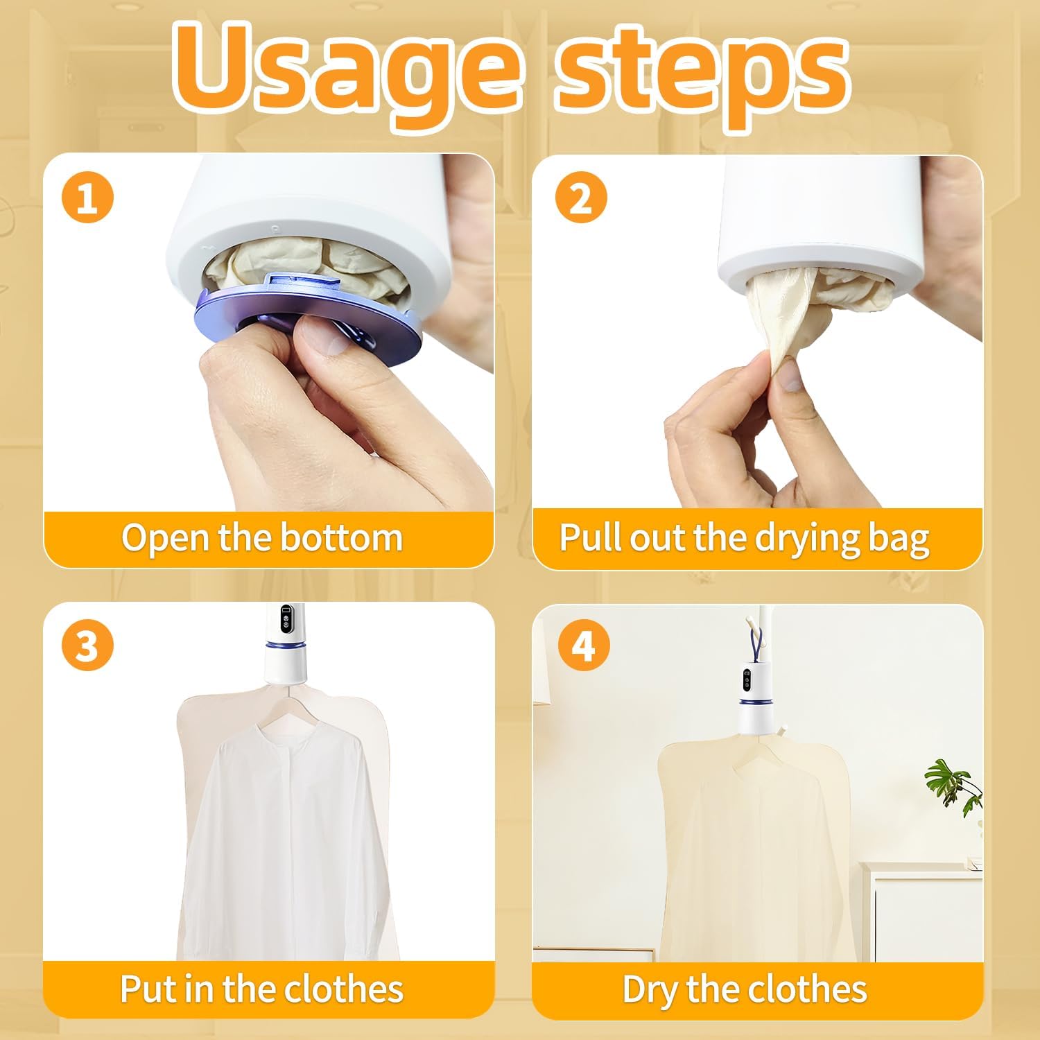 【360° Airflow & Advanced PTC Heating Tech】Equipped with advanced PTC technology, this mini dryer delivers fast and efficient heat. It delivers 360° all-around hot air circulation inside the drying bag, ensuring your garments are dried uniformly and thoroughly with no damp spots left.(Note: Do not dry clothes that are not heat resistant, non-breathable, rubber-treated or delicate(silk, down))