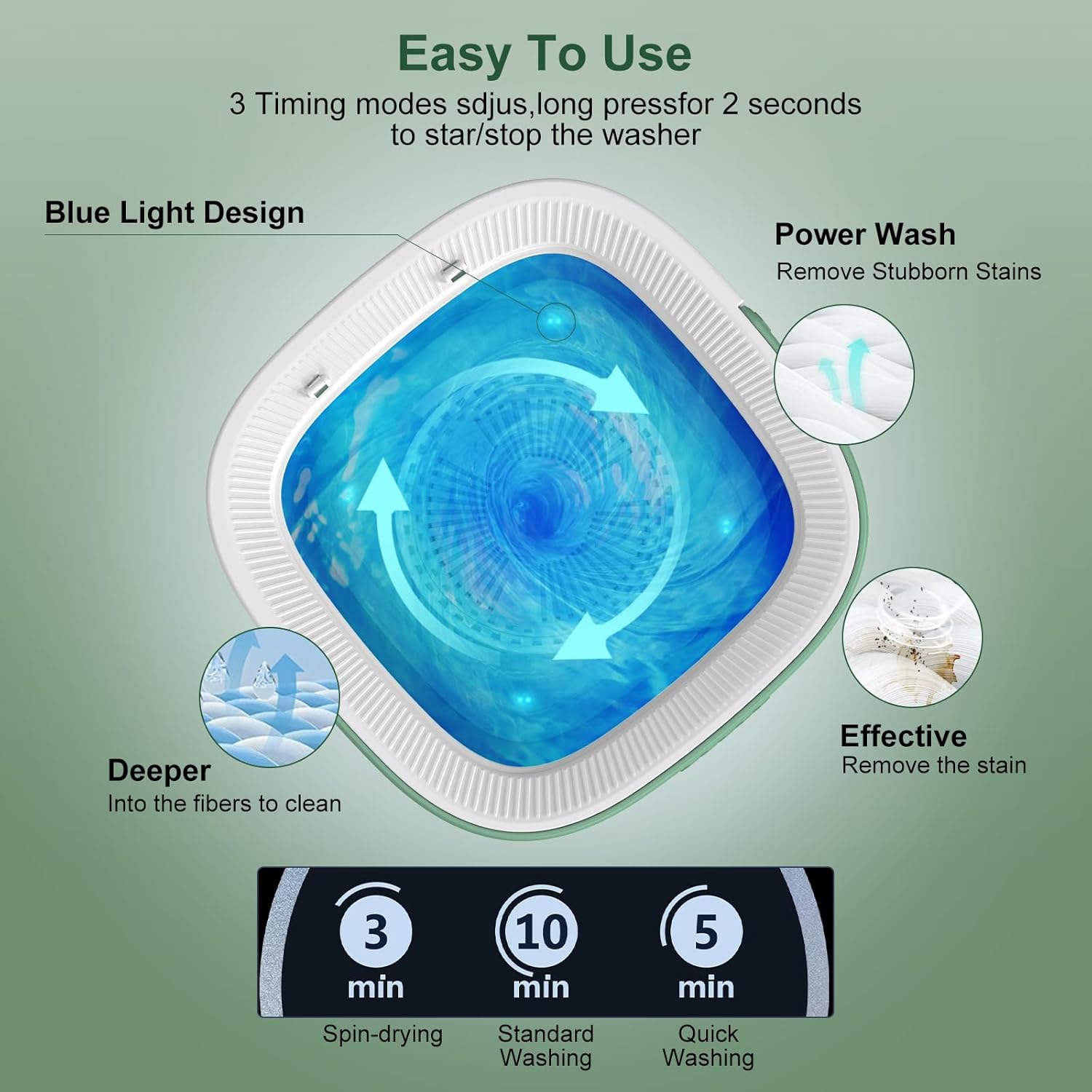 【Intenlligent Cleaning Modes】With three cleaning modes – 3-minute, 5-minute, and 10-minute timer buttons – our mini portable washing machine offers flexibility for various washing requirements. From quick cleans to deep washing, this intelligent cleaning function ensures your clothes are thoroughly cleaned every time.