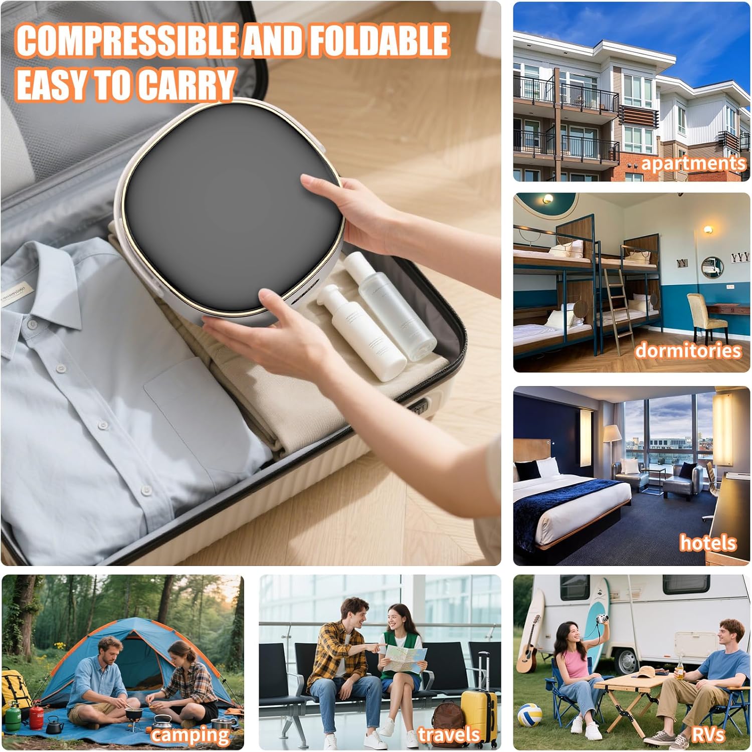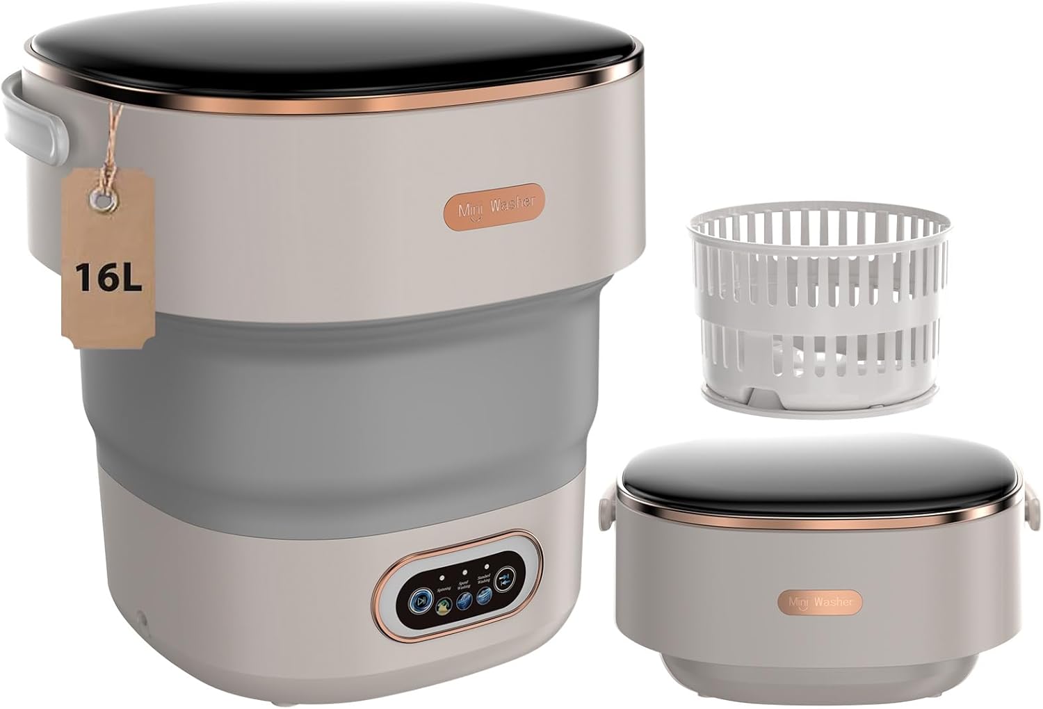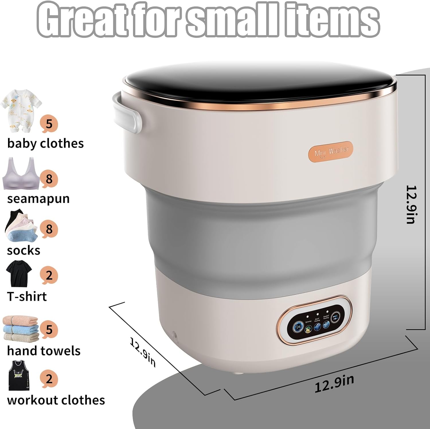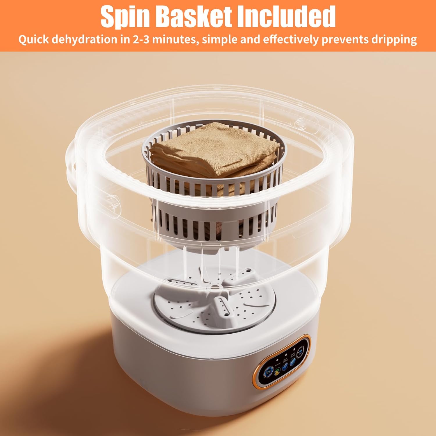 【Portable Washing Machine】: The portable washing machine adopts a foldable design and is equipped with a spin basket. The mini washing machine weighs only 3.5 lbs, compact and easy to carry and is ideal for use in apartments, hotels, dormitories, and camping.