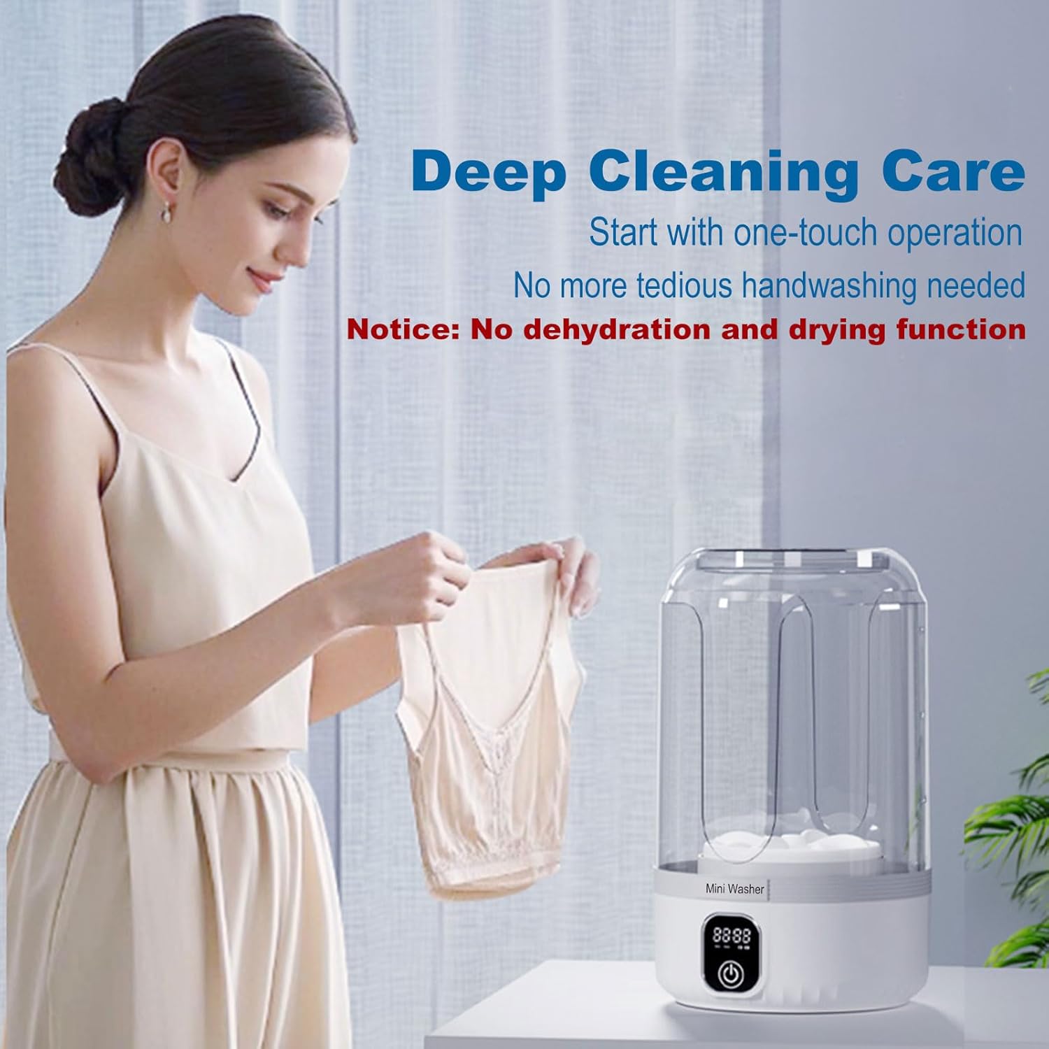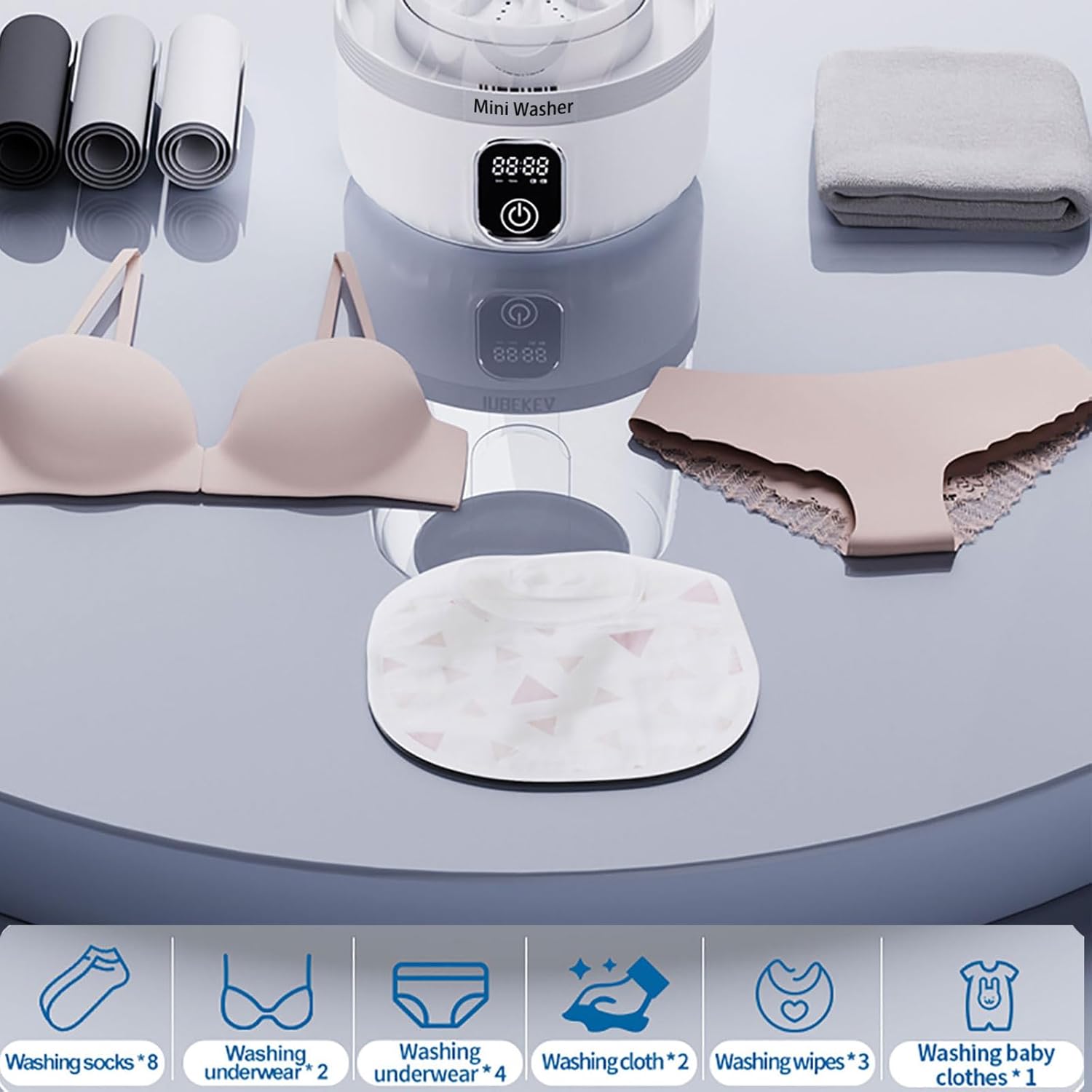 【Deep Cleaning Care】Small washing machine provides all-round imitation hand scrubbing,Combined with the blue – light function,it is very suitable for washing small clothes such as baby clothes, underwear and socks offering a safe and hygienic washing experience for intimate clothing and baby clothes.【Not recommended for large clothes】