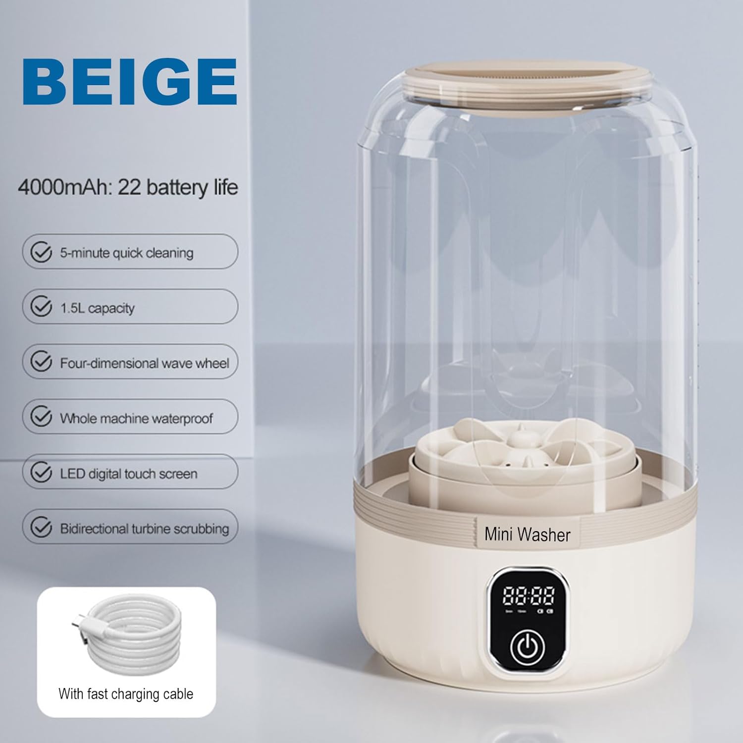 【Underwear Mini Washer】Compact washing machine is equipped with a large 4000mAh battery. It features an LED digital touchscreen, allowing you to clearly see the remaining battery level and selected mode at a glance. With intuitive operation, you can check the washing status at any time
