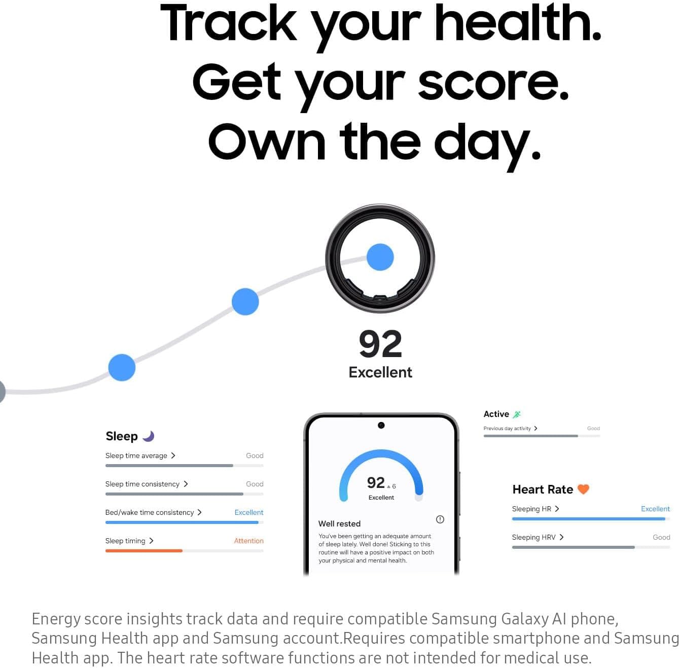 ¹Must wear device for 7 nights during a 30 night period. Requires compatible smartphone and Samsung Health app. ²Based on typical use; results may vary. ³Energy Score insights track data and require compatible Samsung Galaxy AI phone, Samsung Health app and Samsung account. ⁴The heart rate software functions are not intended for medical use. ⁵Consistent with 10ATM water-resistance classification (up to 100m of fresh water for up to 10 minutes) and IP68 rating (up to 6 feet of water for up to 30 minutes). Rinse residue / dry after wet ⁶Available only with walking and running. Auto Workout Detection must be turned on. Requires compatible smartphone. ⁷Wellness Tips track data and require compatible Samsung Galaxy AI phone, Samsung Health app and Samsung account. 8Requires compatible smartphone and Samsung Health app. The heart rate software functions are not intended for medical use. 9Requires compatible smartphone. Cycle Tracking is available for tracking a user’s menstruation cycle. NOT INTENDED FOR CONTRACEPTION. If you are currently taking hormonal birth control or undergoing hormonal treatment that inhibits ovulation, this service will not be useful for tracking ovulation. Cycle Tracking results may be impacted by Watch usage (recommendation: 4 hours during sleep, 5 times a week), input data and environmental conditions (such as illness, medications, traveling and disruptions to users’ daily routine). If you are taking medication, consult your doctor to learn how it may impact your body temperature. Do not interpret or take clinical action based on the predictions made without consultation of a qualified healthcare professional. This feature is not intended for users under 18 years of age.