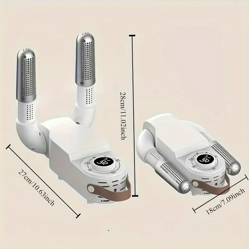Featuring 360-degree rotatable and detachable support stands, our shoe dryer can be effortlessly assembled and disassembled without tools. The intelligent timer ranges from 0-120 minutes and automatically shuts off when the cycle is complete, ensuring convenient and hassle-free operation.