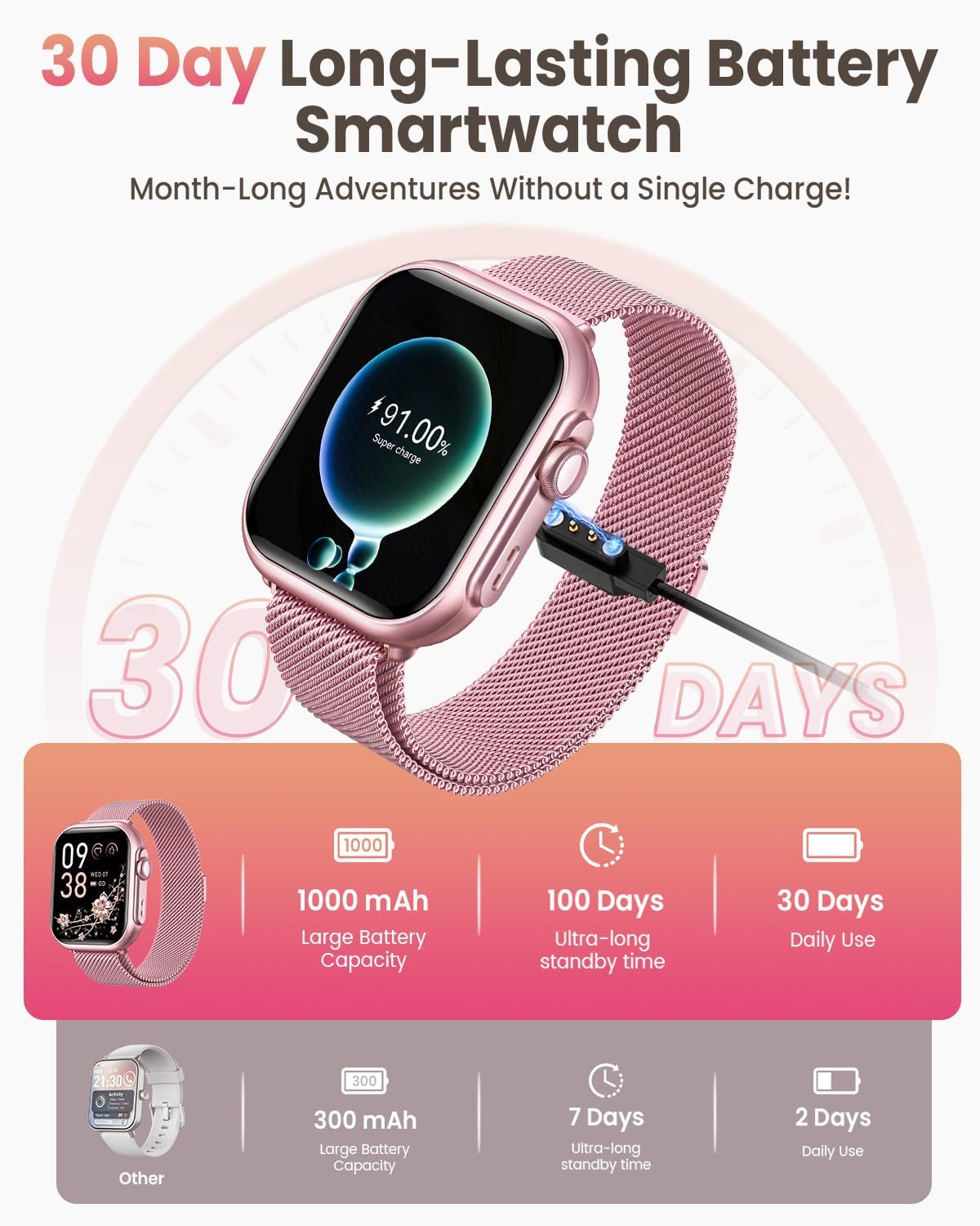 30 Days+ Battery Life:Smart watches for men women features a massive 1000mAh battery, offering 30 days of use (100 days standby) on a single 2.5-hour charge. Perfect for outdoor adventures, business trips, or daily fitness tracking without constant charging. Compatible with iOS 9.0+ and Android 6.0+ smartphones, it outperforms some other android smart watch and smart watch for iPhone compatible devices in battery capacity