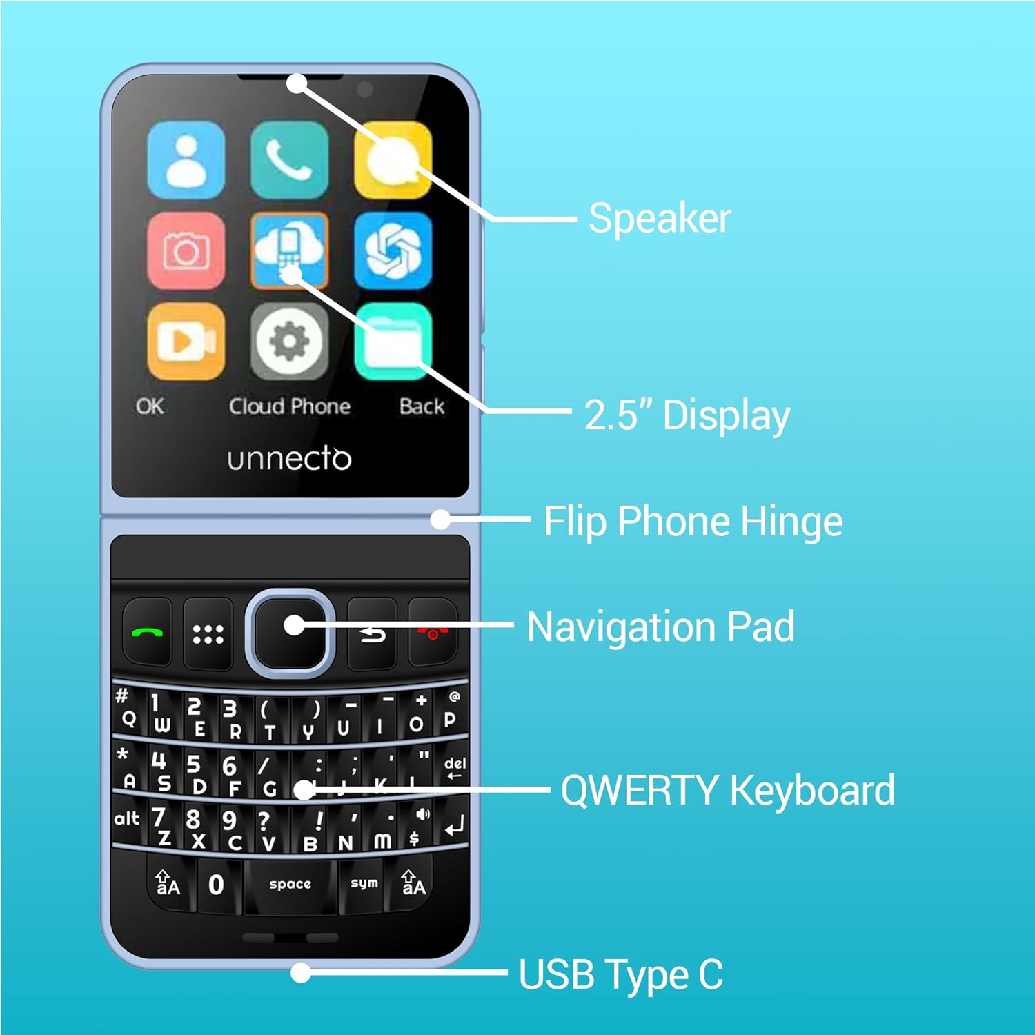 The Unnecto Snap flip feature phone combines the simplicity and reliability of a classic flip phone with modern capabilities, offering a user-friendly experience for those who want the basics with a touch of convenience. The 2.5″ screen provides a compact display, making it easy to navigate and view messages and calls without unnecessary distractions. One of the standout features is the physical QWERTY keyboard, which makes texting and typing faster and more accurate than on a typical on-screen keyboard. For those who prefer a more tactile typing experience, the Snap provides a comfortable and responsive option that many users still find preferable to touchscreen typing. Beyond its traditional features, the Unnecto Snap incorporates modern elements that make it more versatile, such as 32GB microSD support for expanded storage, allowing you to store your photos, music, and files without worrying about space. The 2MP main camera offers enough resolution for basic photography needs, whether you’re capturing quick snapshots or videos. Additionally, the Cloud OS opens up access to social media and internet applications, bridging the gap between classic and contemporary functionality. With this, users can stay connected to their social networks and browse the internet at their own pace, making the Unnecto Snap a great option for those who want a simple, functional device with just the right amount of modern connectivity.