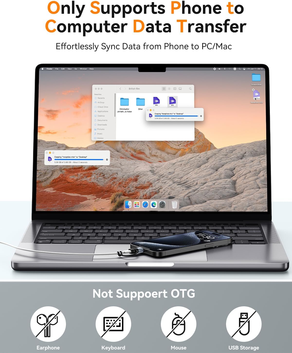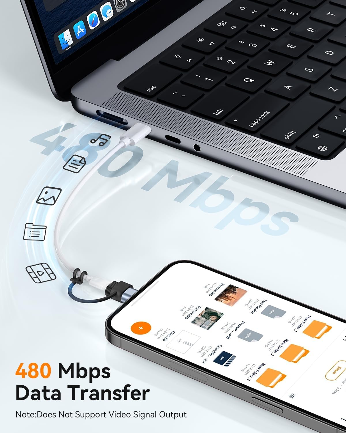Pay Attention Before Purchased:Please Note the adapter can be only used for Charging and Data Transfer between Phone and Laptop. ❌ Not support OTG video and audio function,❌ Lightning headphones,❌ Not for A-pple Pencil,❌ Flash drive,❌ SD card reader, square reader,printer,❌ Microphone,Camera,Mouse,MIDI keyboard,Hubs,HDMI Converter,etc