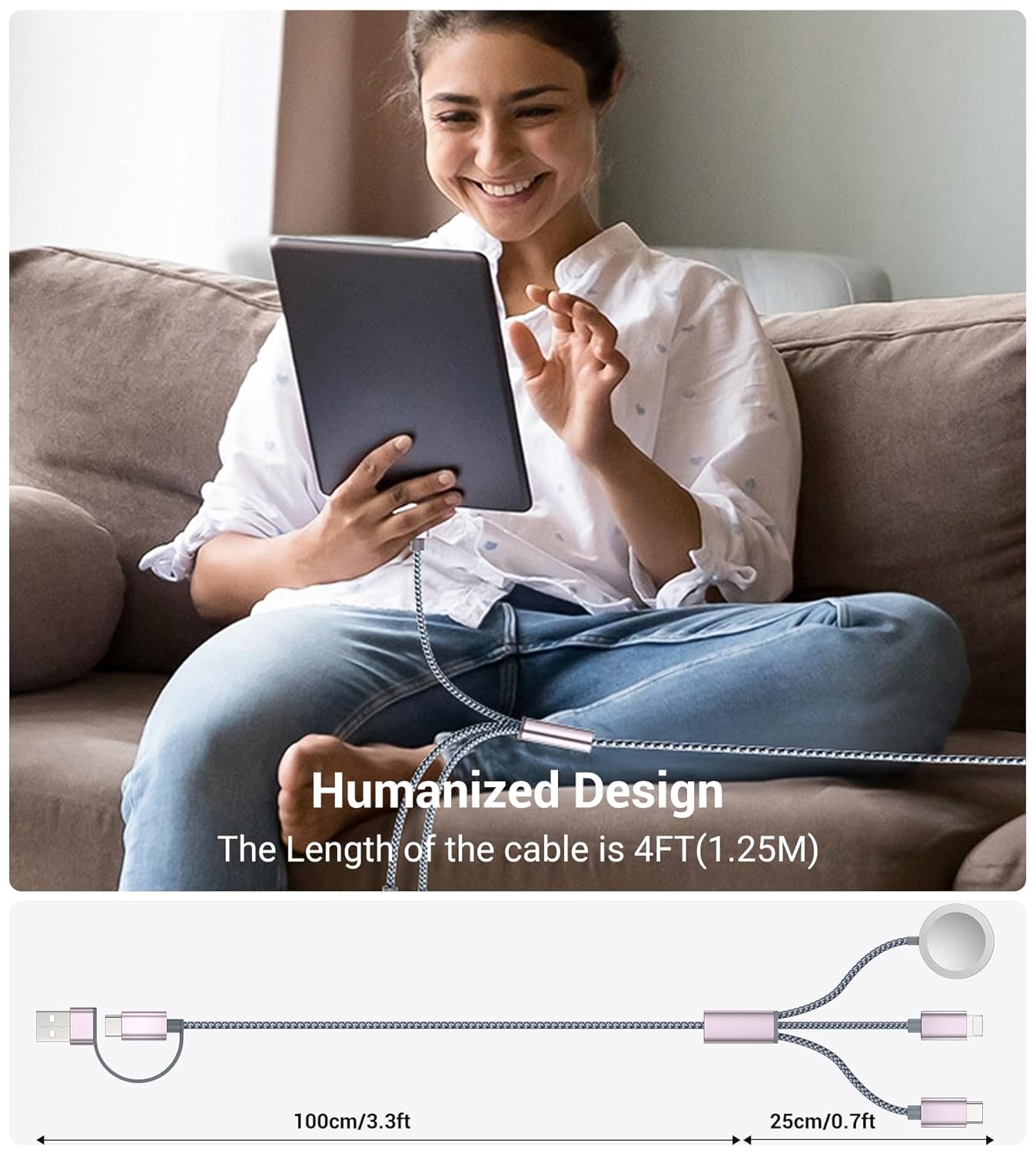 【Vacation Travel Essentials & Car Accessories & 4FT Length】Designed as travel cable.The 4ft 3-in-2 USB-C cable is a vacation travel essential, a must have car accessory,and perfect for your beach vacation essentials. Use this portable charging cable compatible with Apple Watch,iPhone,other USB-C/Lightning devices on airplanes, cruises, road trips in the car, or with power banks.