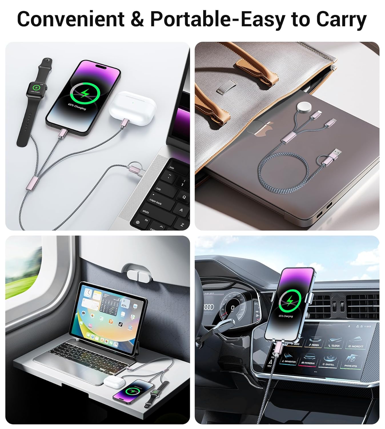 【3-in-2 Multi Charging Cable】3-in-2 multi charging cable provide 6 charging modes (USB-C/A for Apple Watch charger, Lightning, and Type-C),which compatible with iWatch Series 1-9, SE, and Ultra models, compatible with iPhone 17/16/15 and newer models,and iPads (Lightning/USB-C).A portable travel charger and a universal charging cable for multiple devices,designed to charge multiple devices at once