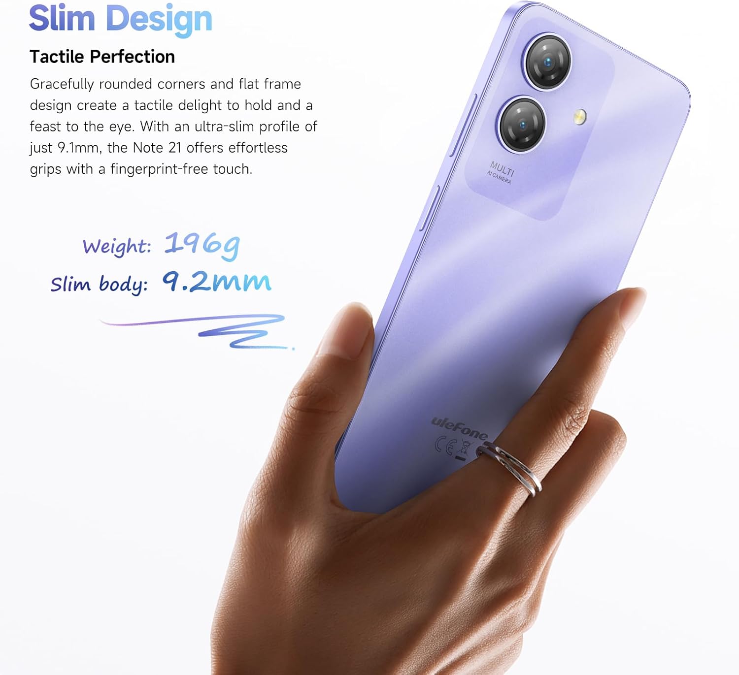 【Slim Body, Elegant Design】: The Ulefone Note 21 comes with a slim case that weighs 9.2 mm thick and 196.1 g, super light and thin. It features an elegant starlight design, combined with a 2.5D waterdrop screen and rounded corners, which provides an elegant curly edge and a sleek, low-profile frame design that not only looks extremely beautiful, but also provides a comfortable grip and demonstrates modern style.
