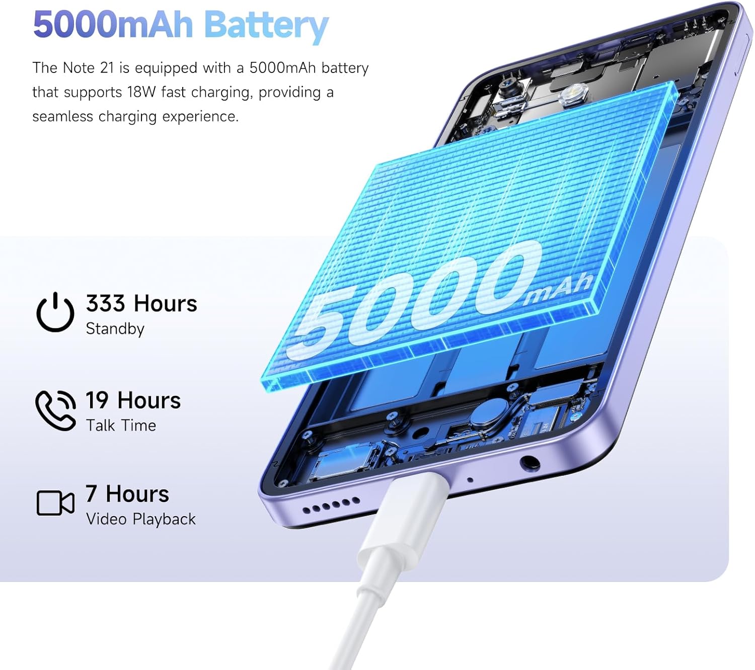 【5000 mAh Battery + Power Bank Function】: the Ulefone Note 21 has a 5000 mAh battery that offers long-lasting performance. The standby time of up to 333 hours, talk time of up to 19 hours and 7 hours of video playback. Supports OTG function, you can use it as a power bank to charge other phone watch earbuds.