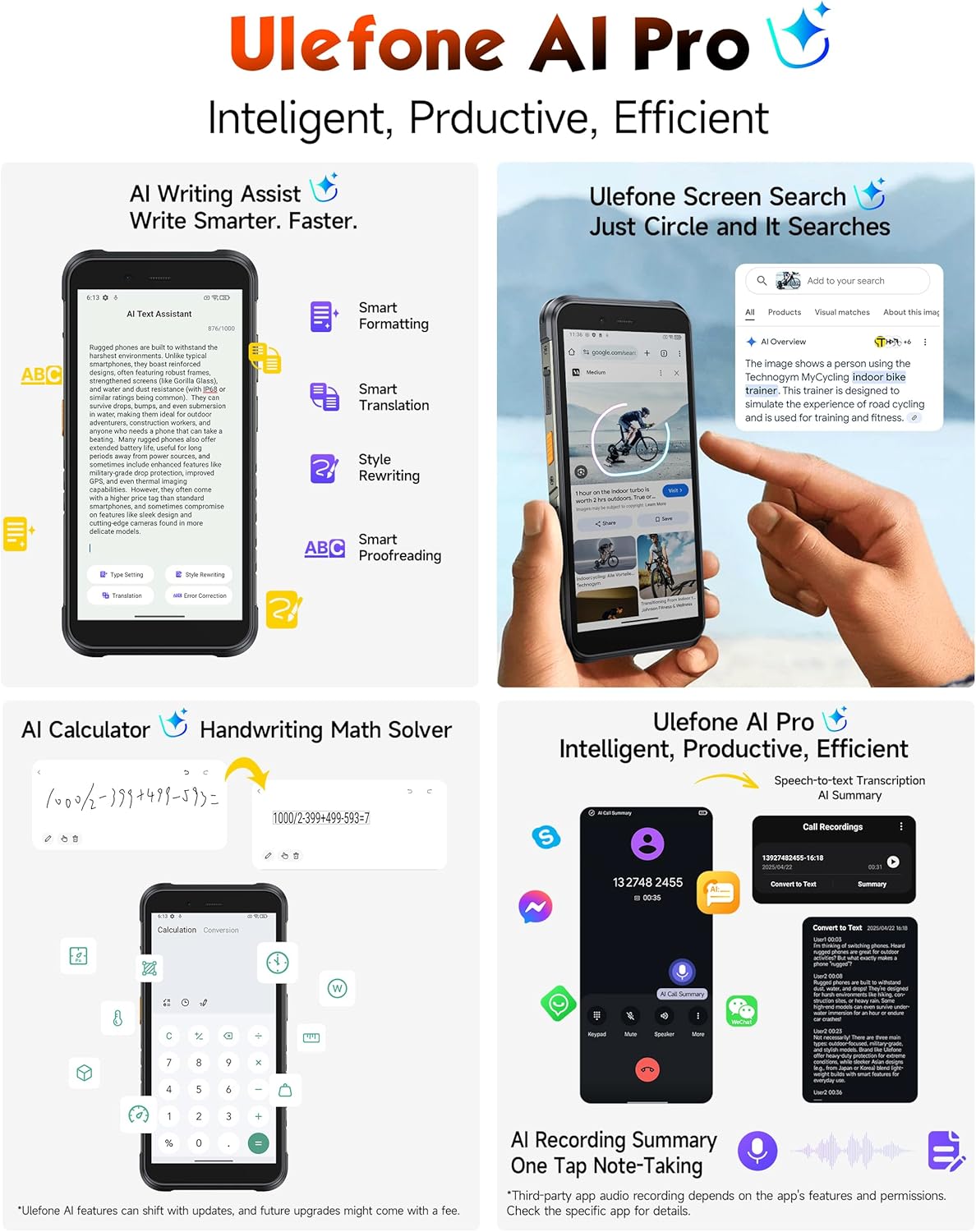 🌠【AI Assistant – Google Gemini & Ulefone Al Pro】Ulefone Al Pro, your Al assistant is ready: Al recording summary, Al Writing Assis, Ulefone Screen Search, Al Calculator. With the Rugking, you can effortlessly harness the power of Google Gemini, ChatGPT, and Grok, etc. This enables seanless brainstorming, crystal-clear concept clarification, and efficient task streamlining whether youre recapping meetings or researching complex topics. ❌ PS: Third-party app audio recording depends on the app’s features and permissions.