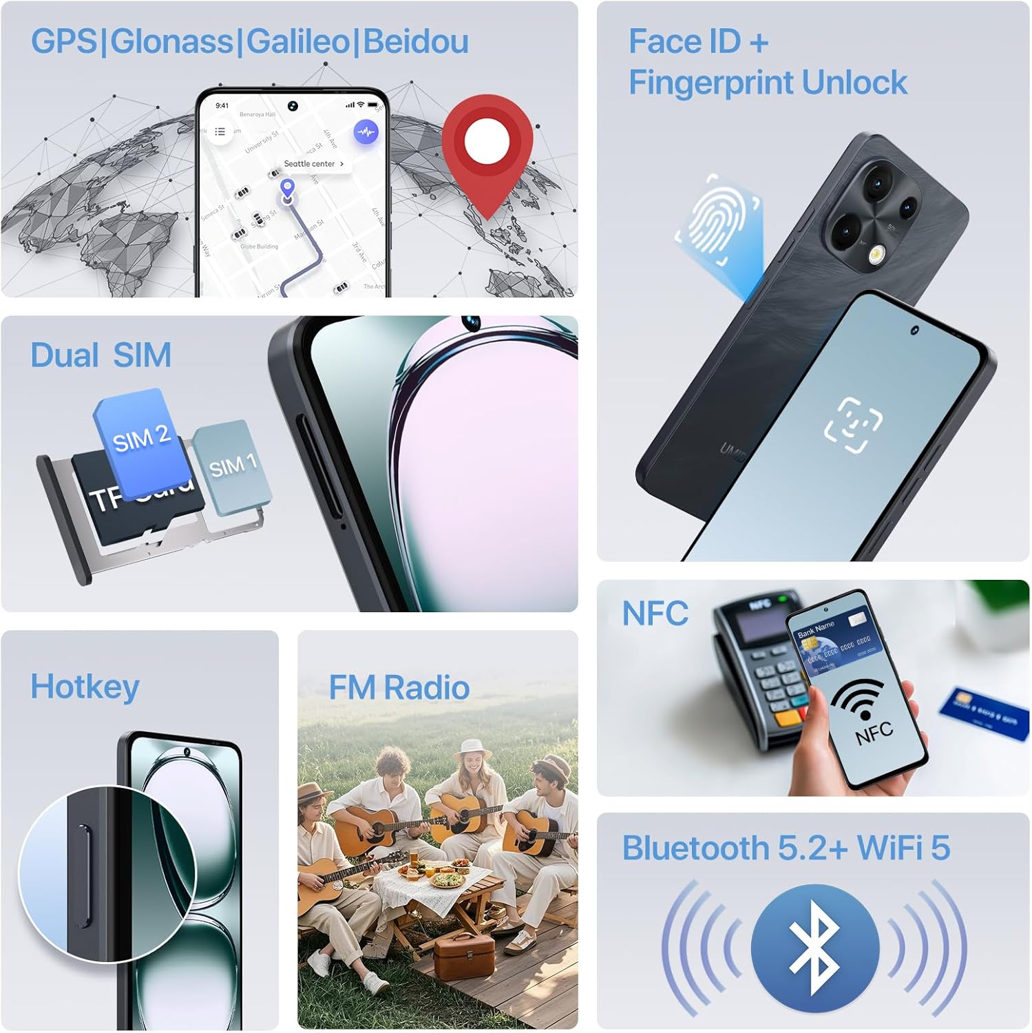 𝐎𝐭𝐡𝐞𝐫 𝐅𝐞𝐚𝐭𝐮𝐫𝐞𝐬: This smart phone unlocked android has a 3.5mm headphone jacksupport face and fingerprint unlocking. Compatible with NFC,FM radio, OTG functionality. Bluetooth version 5.2. Built-in GPS, GLONASS, BeiDou and Galileo. Easy to use, very practical.