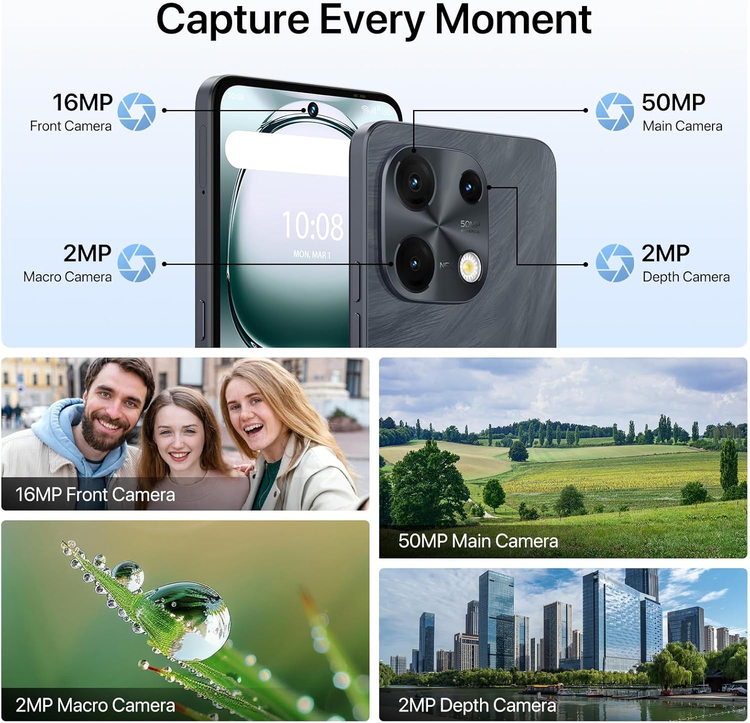 𝟓𝟎𝐌𝐏 𝐌𝐚𝐢𝐧 𝐂𝐚𝐦𝐞𝐫𝐚+𝟏𝟔𝐌𝐏 𝐅𝐫𝐨𝐧𝐭 𝐂𝐚𝐦𝐞𝐫𝐚: Take better photos in different scenes.The UMIDIGI Note 100 phone unlocked comes with a 50MP main camera,2MP macro lens,2MP depth camera and advanced image processing technology, the 16MP front camera that captures stunning selfies and makes HD online calls as ease.