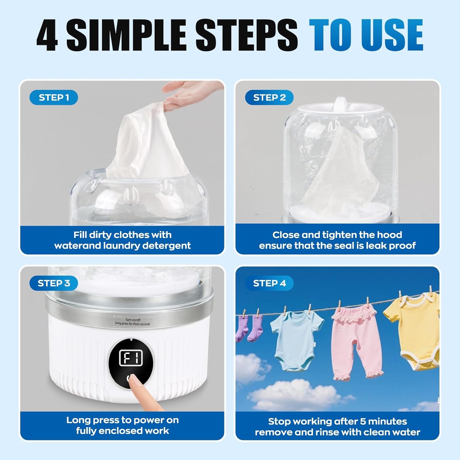 USB Rechargeable and Travel-Ready: This portable washer runs wire-free for hours, making laundry convenient anywhere; no outlets, no problem—just use any USB port to power it up; whether in a hotel room, campground, or on a business trip, this tiny washing machine ensures fast, hassle-free garment care