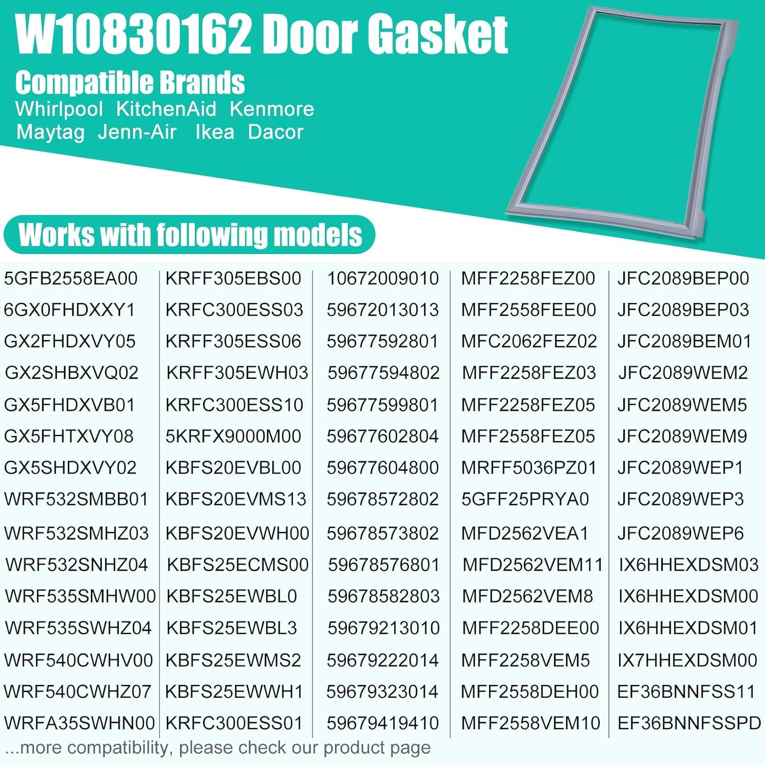 [Wide Compatibility] W10830162 fridge door gasket compatible with Whirl-pool, Ken-more, Kitchen-Aid, May-tag, Jenn-Air, Dacor. Including WRF535SWHZ, WRF535SMBM, KRFC300ESS, KRFF305ESS and WRF535SWHV, IX6HHEXDSM00, IX6HHEXDSM01, IX7HHEXDSM00, KBFS20EVMS13, KBFS22EWMS9, KRFC300ESS01, KRFF305ESS00, WRF535SMBM00…more compatibility, please check our product page. Before purchasing, check your device’s model number to ensure compatibility.