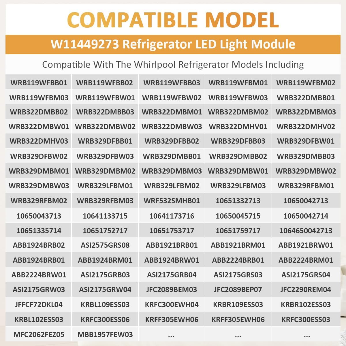 Refrigerator Freezer Light Bulb Replacement part number: w11449273 w11520324 w11251749 kenmore refrigerator light bulb replacement: W11602886 AP7192759 W11468934 AP6986570 W11549780 whirlpool refrigerator led light, Please check if it is the replacement part number you need before you buy, a small gesture to make your buying experience better.
