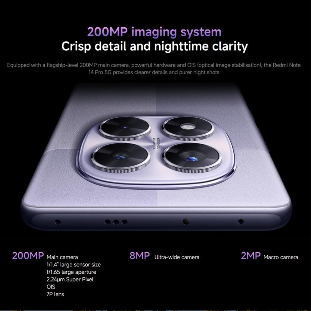 Equipped with a flagship-level 200MP main camera, powerful hardware and OIS (optical image stabilisation), the Redmi Note 14 Pro 5G provides clearer details and purer night shots.