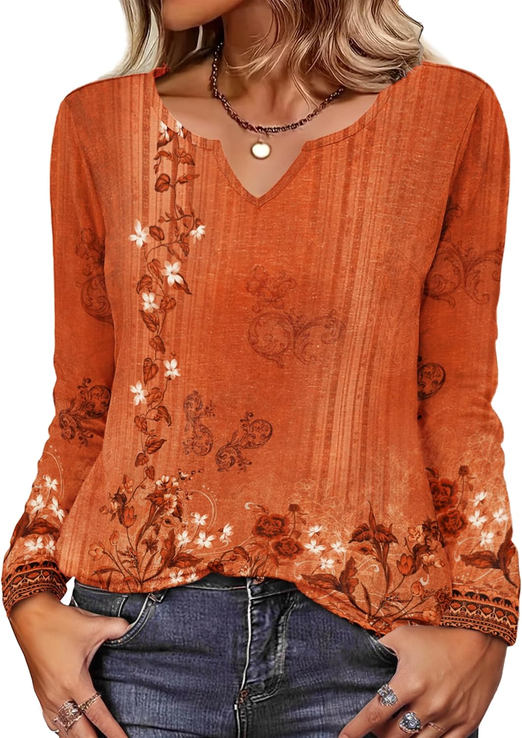 Boho Tops for Women Long Sleeve V Neck Shirts Dressy Casual Blouses Fall T Shirts Loose Fit Business Work Clothes